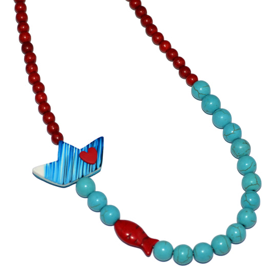 Μακρύ κολιέ με ιδιαίτερο κόψιμο ριγέ τυρκουάζ με κρεμαστή κόκκινη καρδιά και ατσάλινη αλυσίδα