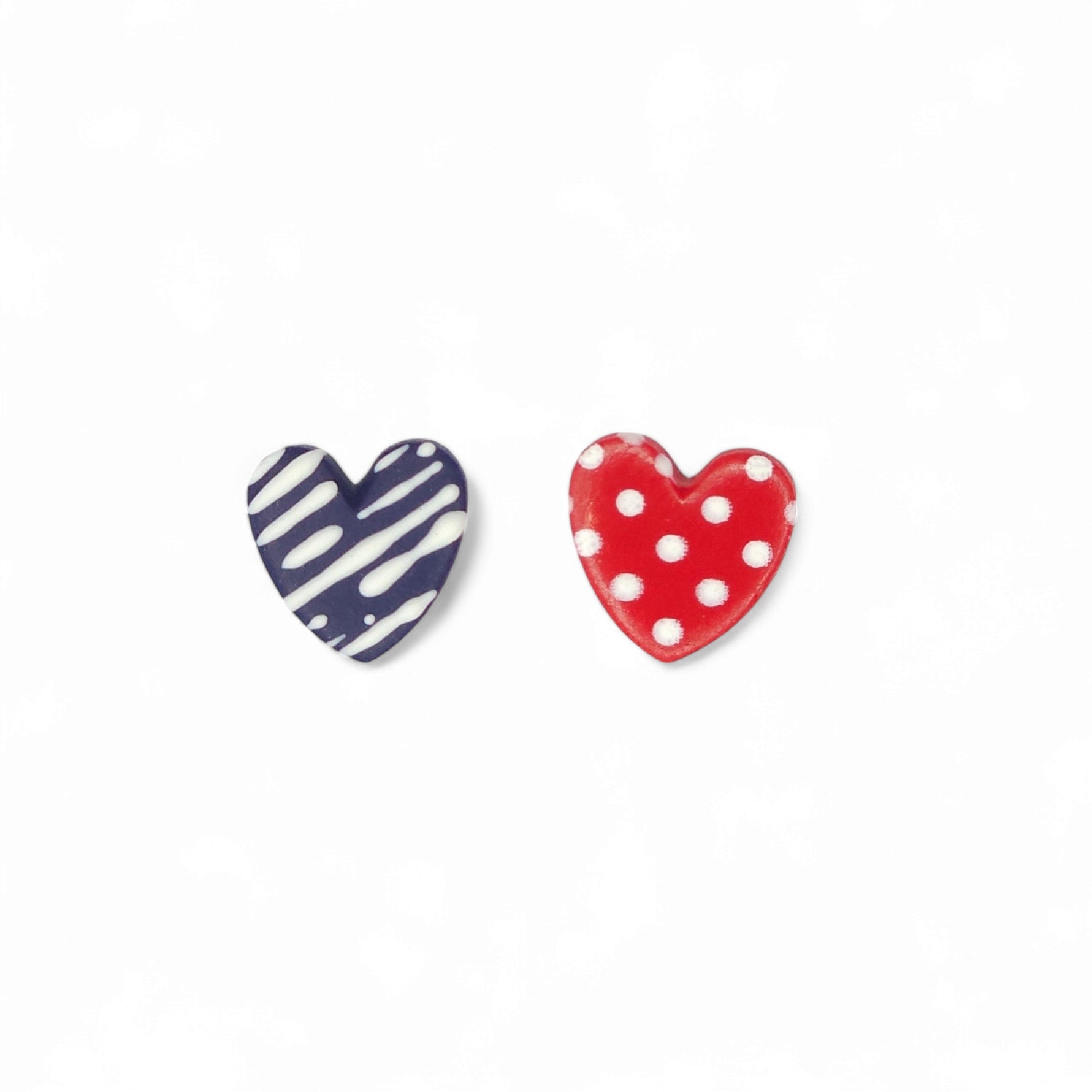 Ανόμοια καρφωτά σκουλαρίκια καρδούλες, μία μπλε ριγέ και μία κόκκινη πουά από πολυμερικό πηλό.
