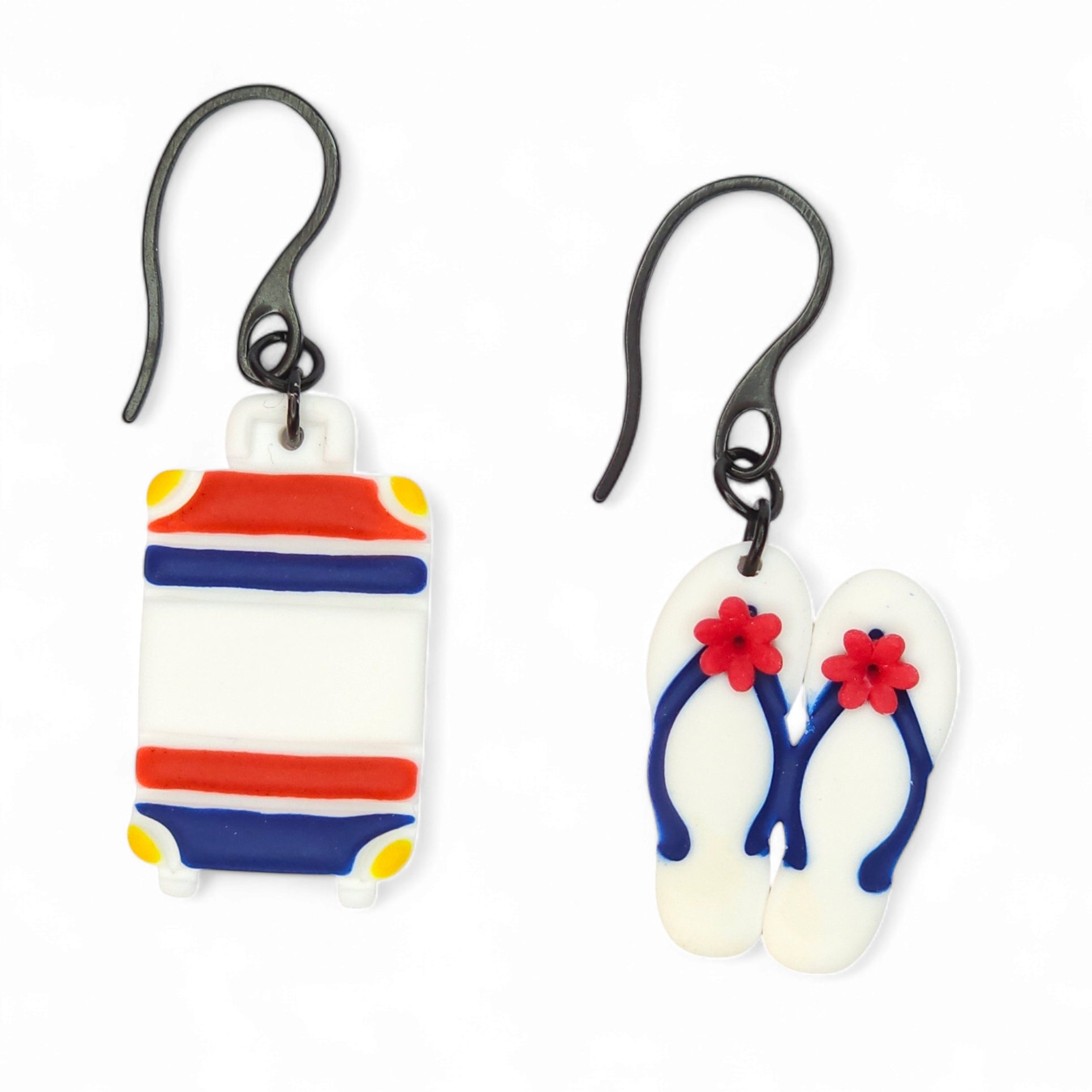 Καλοκαιρινά ανόμοια κρεμαστά σκουλαρίκια λευκή βαλίτσα και σαγιονάρες με κόκκινες και μπλε λεπτομέρειες από πολυμερικό πηλό.