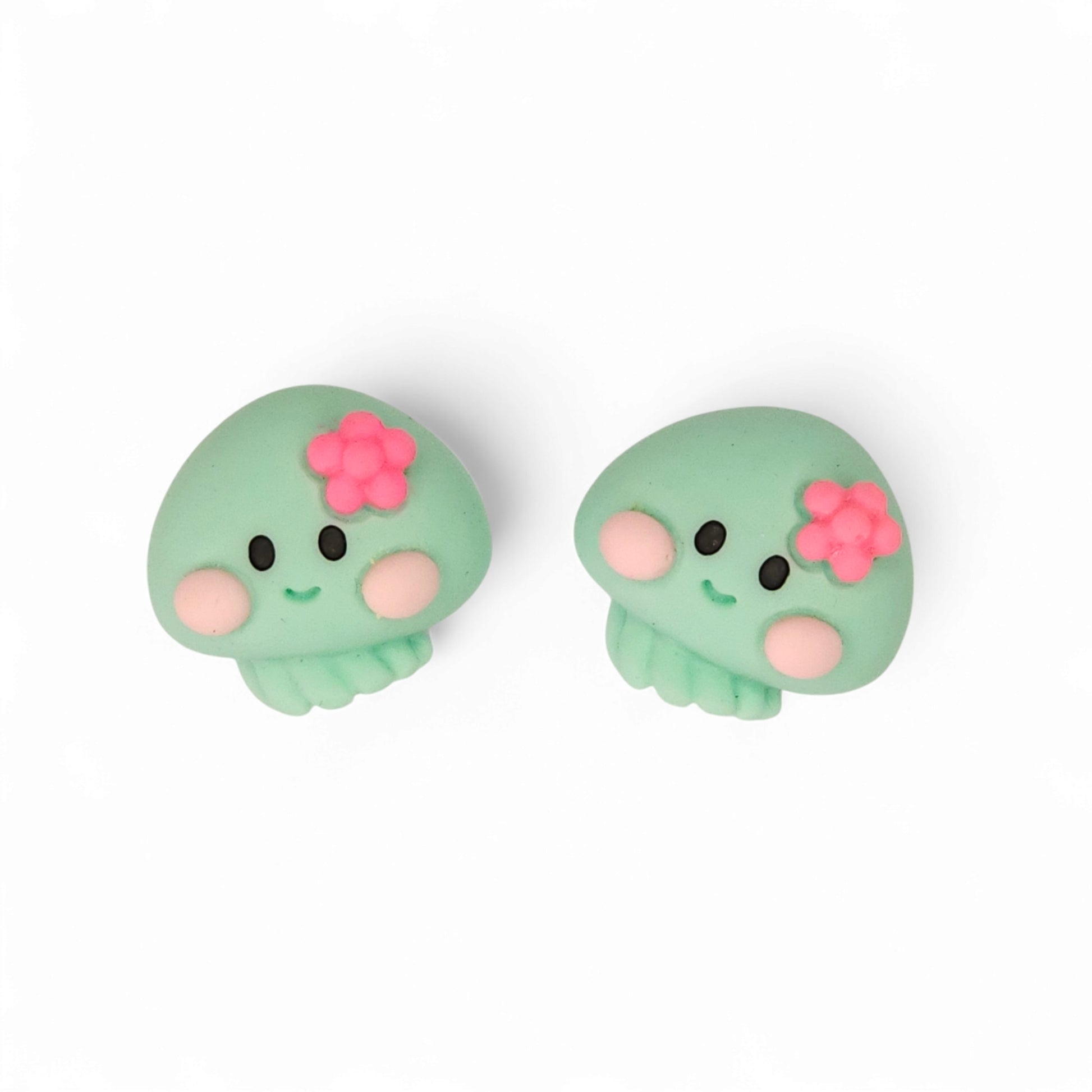 Καρφωτά καλοκαιρινά σκουλαρίκια τυρκουάζ μεδουσάκια με φούξια λουλουδάκια στο κεφάλι, από ακρυλικό ζωγραφισμένα στο χέρι.