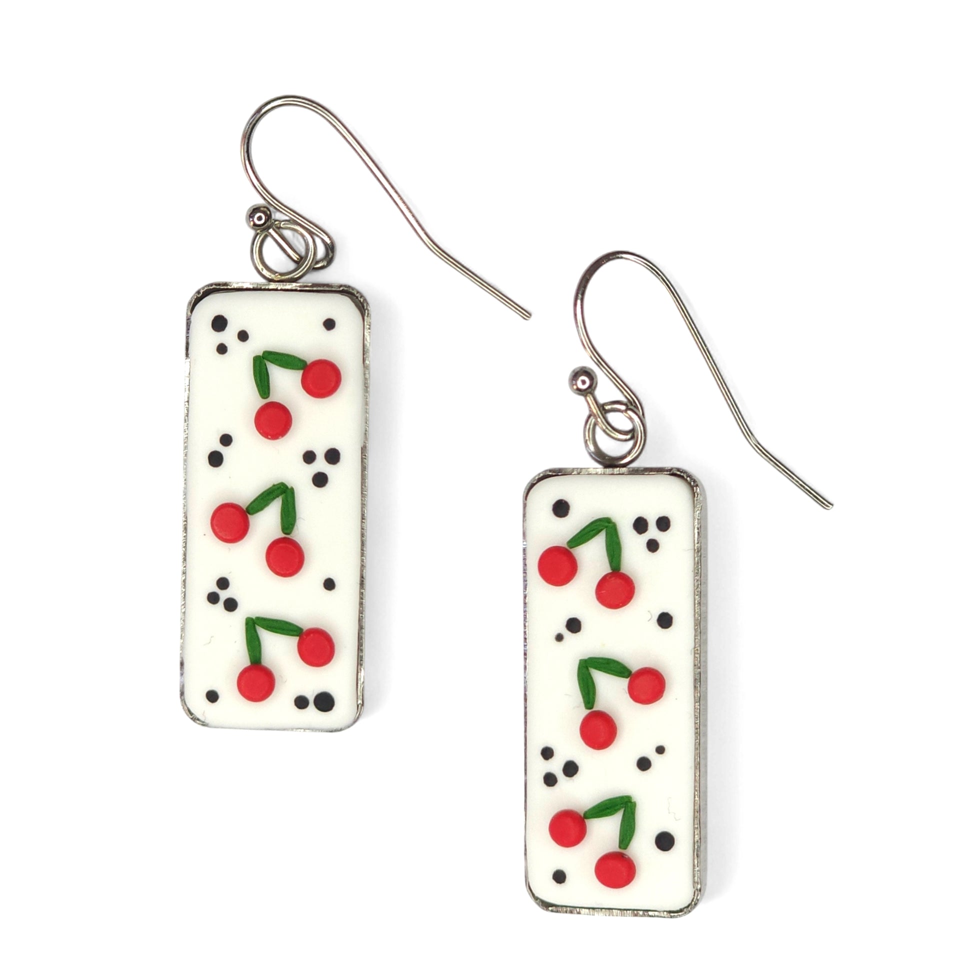 Κρεμαστά παραλληλόγραμμα σκουλαρίκια με μικρούτσικα κόκκινα κερασάκια σε λευκό φόντο με τοσοδούλικες μαύρες βουλίτσες από πολυμερικό πηλό.
