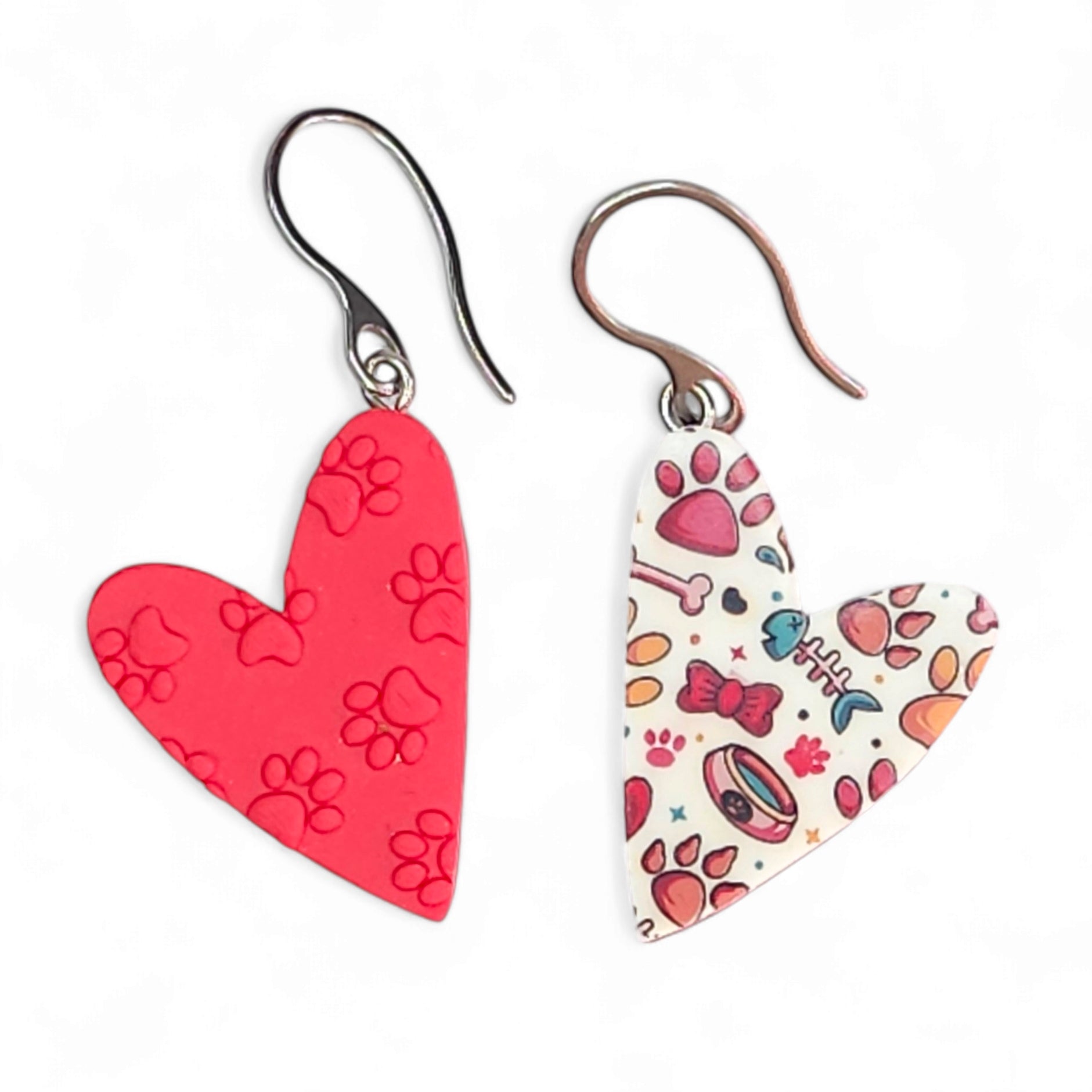 Κρεμαστά σκουλαρίκια ανόμοιες καρδιές μία με μοτίβο της συλλογής Eat play love και μία κοραλλί από πολυμερικό πηλό.