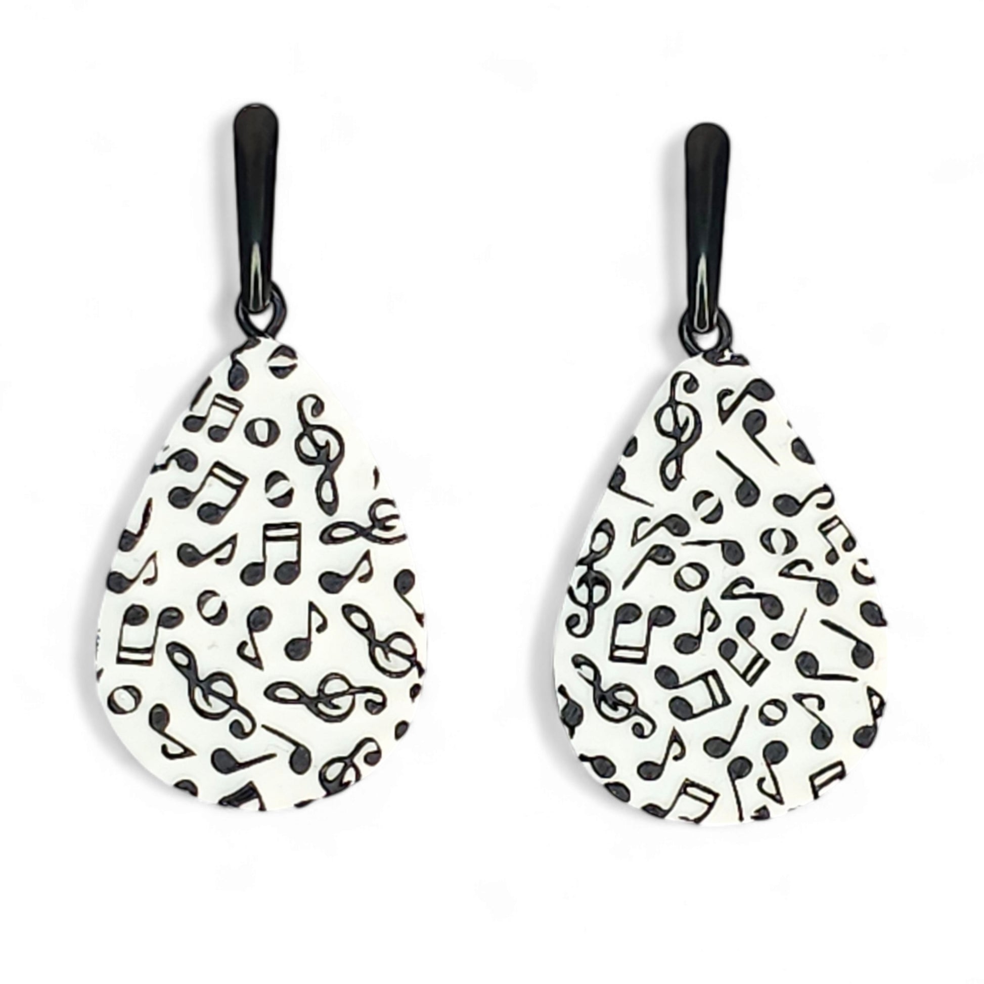Κρεμαστά σκουλαρίκια ασπρόμαυρα δάκρυα με μουσικές νότες από πολυμερικό πηλό και μαύρα ατσάλινα καρφάκια ράβδοι