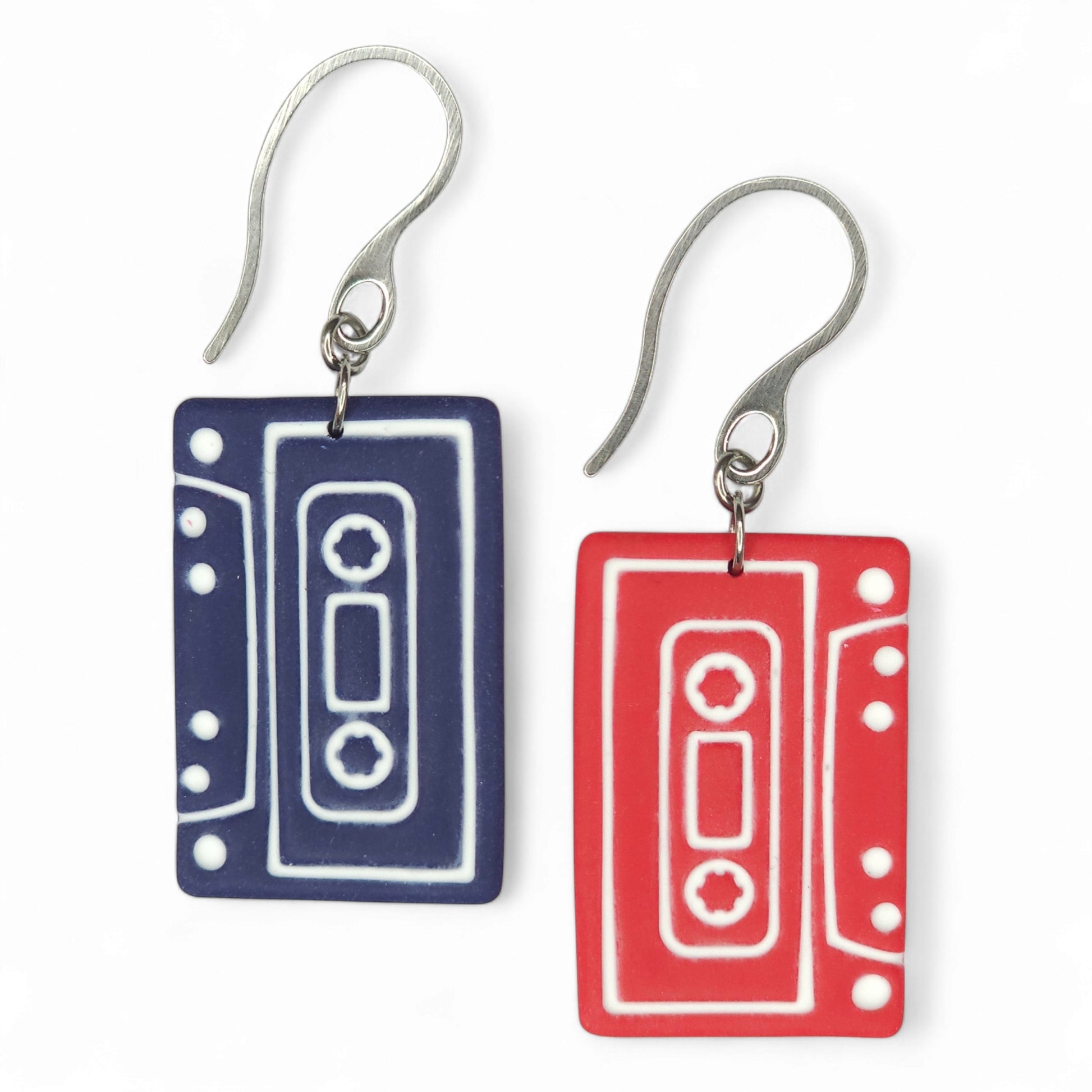 Κρεμαστά σκουλαρίκια κασέτες μία μπλε και μία κόκκινη με λευκές λεπτομέρειες από πολυμερικό πηλό.