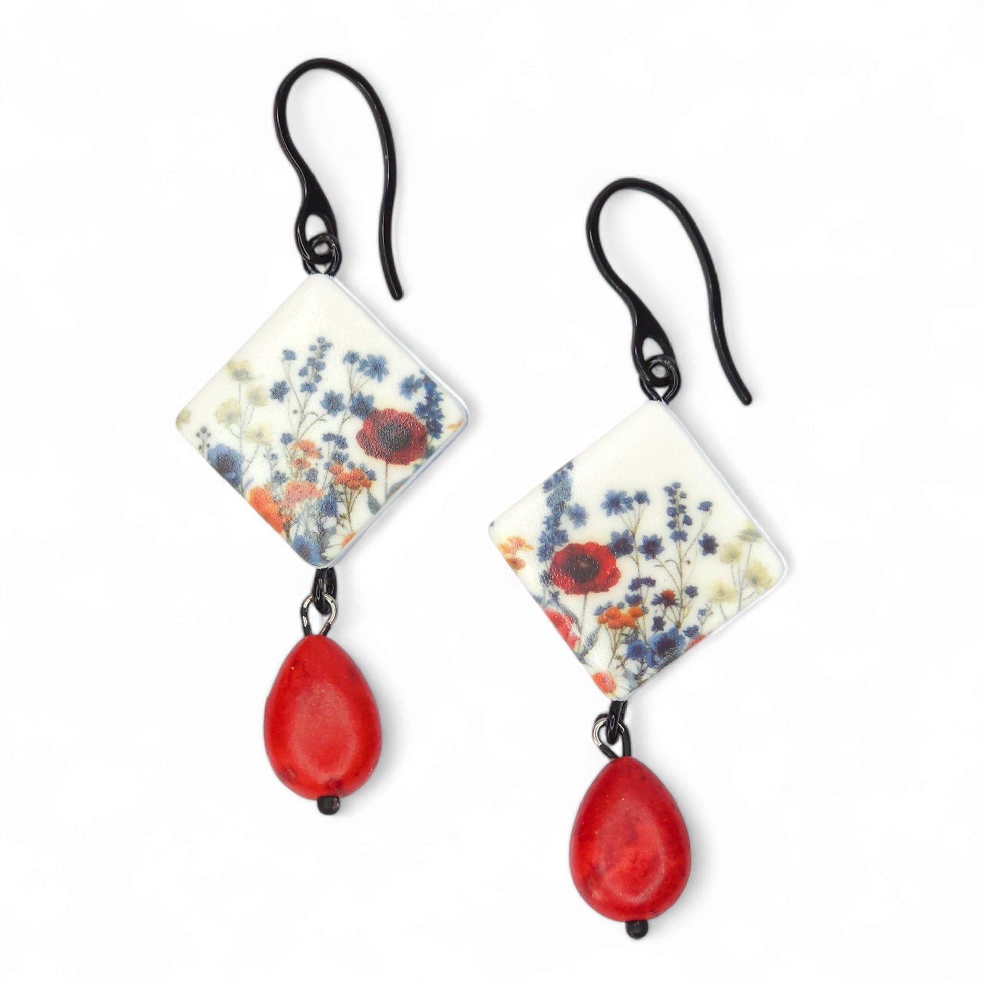 Κρεμαστά σκουλαρίκια με τετράγωνα στοιχεία με μοτίβο λουλούδια του αγρού από πολυμερικό πηλό, κόκκινες πέτρες χαολίτη και μαύρα υποαλλεργικά γαντζάκια από ανοξείδωτο ατσάλι.