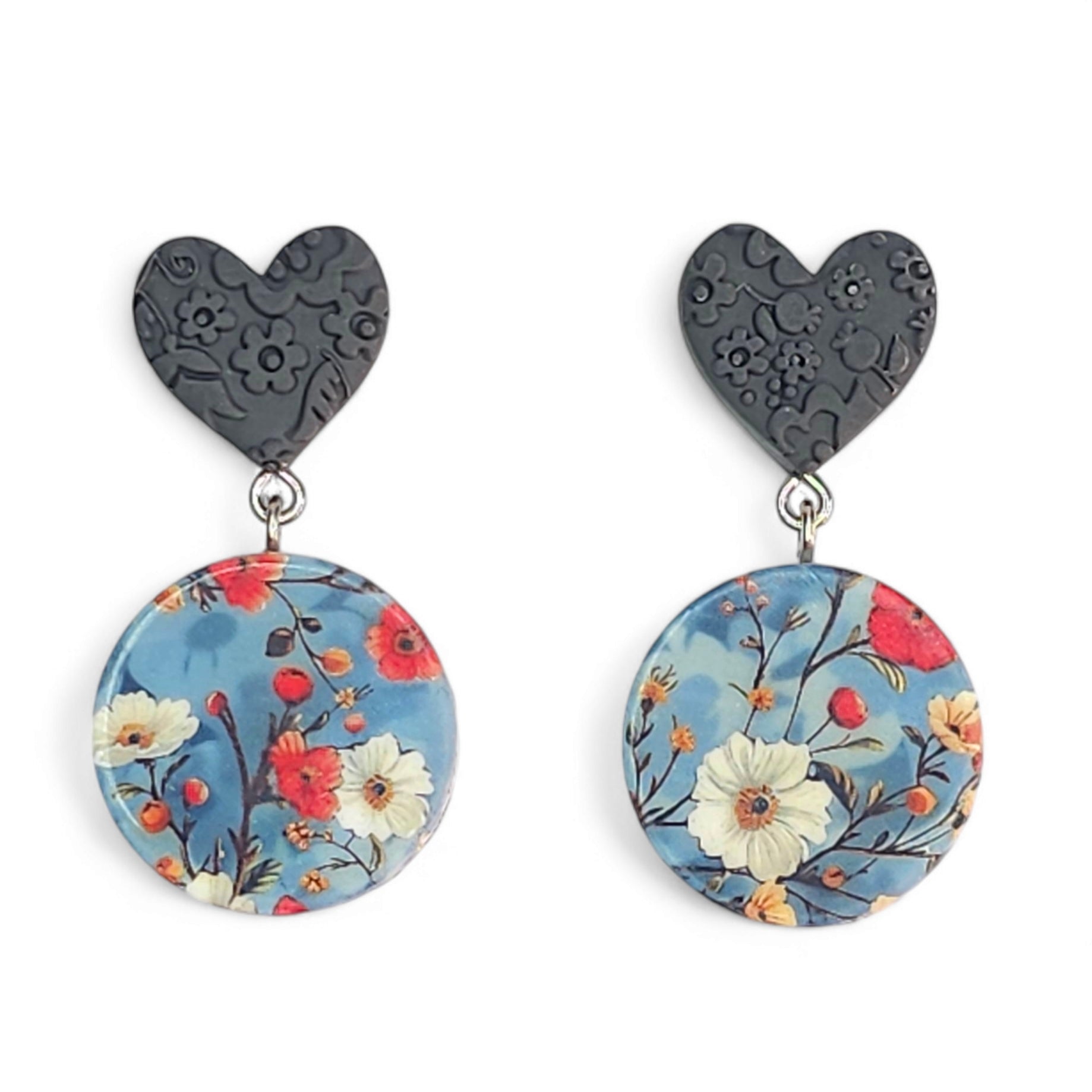 Κρεμαστά σκουλαρίκια με τεχνική μεταφοράς εικόνας σε πολυμερικό πηλό με γκρι καρδιές