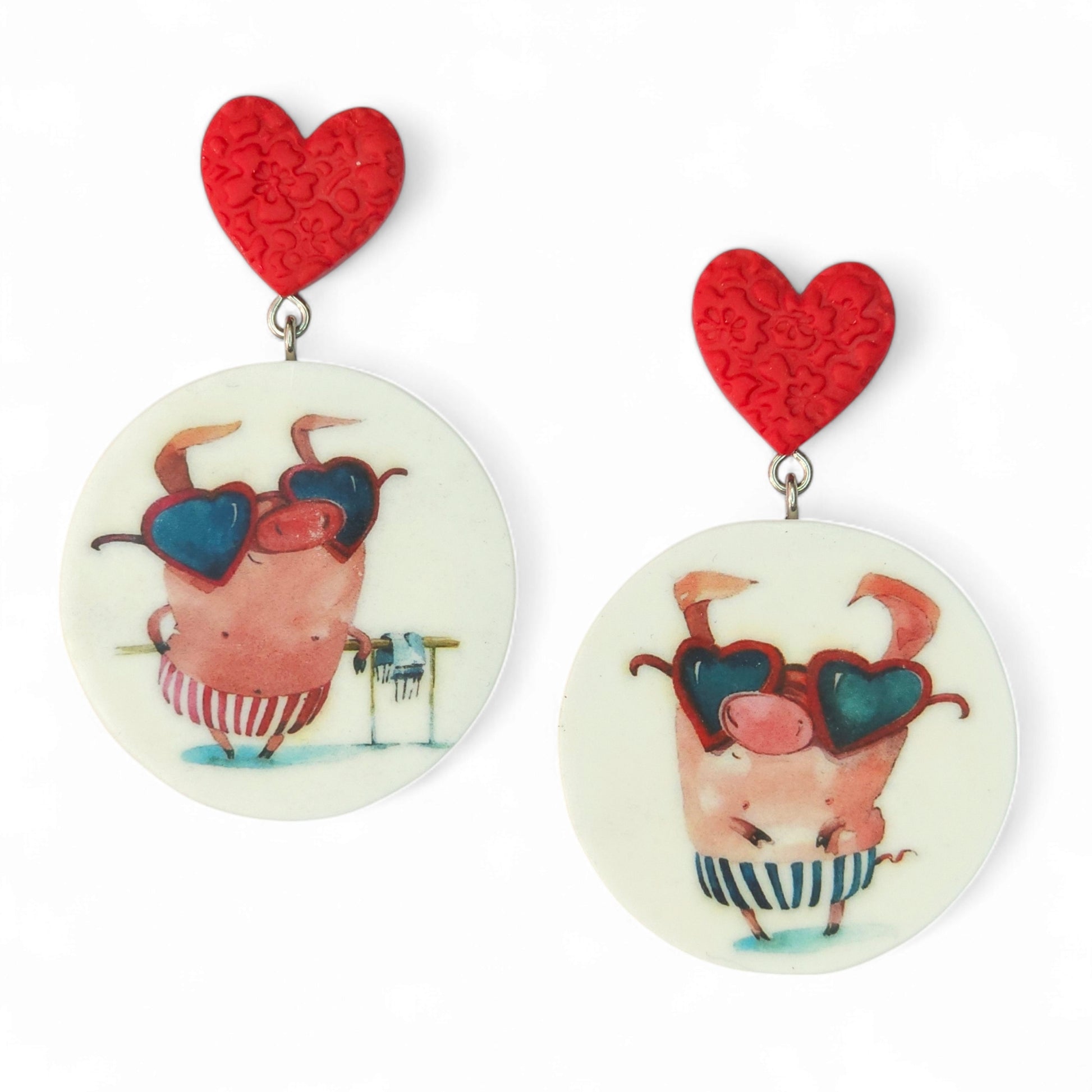 Μεγάλα εντυπωσιακά παιχνιδιάρικα κρεμαστά καλοκαιρινά σκουλαρίκια με γουρουνάκια με μαγιό και κόκκινες ανάγλυφες καρδούλες από πολυμερικό πηλό.