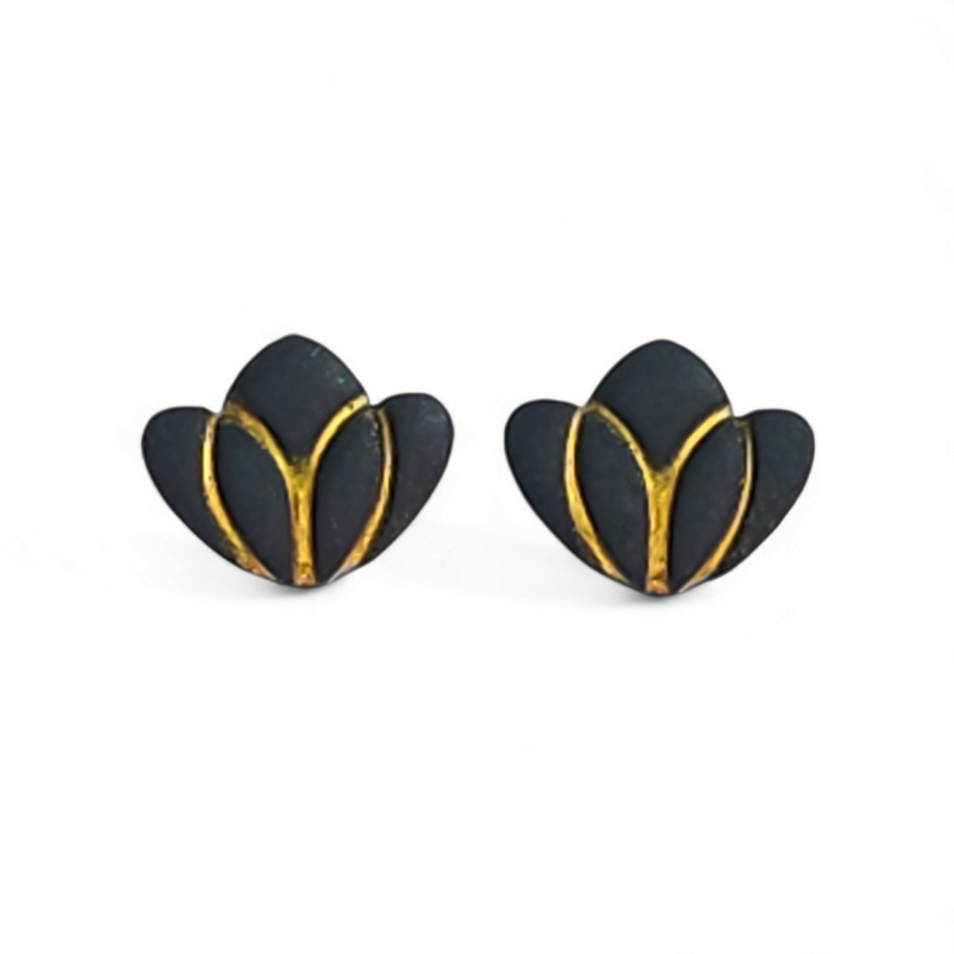 Μικρά καρφωτά κομψά μαύρα σκουλαρίκια με χρυσές λεπτομέρειες από πολυμερικό πηλό.