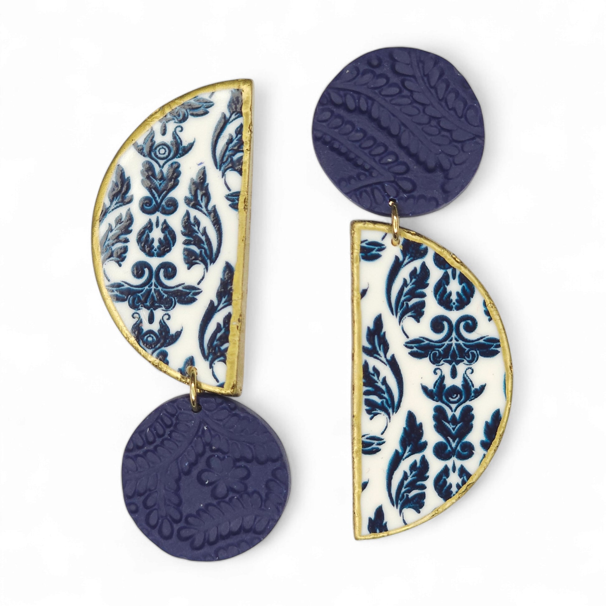 Χειροποίητα σκουλαρίκια ανόμοια, ένα ημικυκλικό στοιχείο με μπλε μεταξοτυπία σε μπαρόκ στυλ κι ένα στρογγυλό ανάγλυφο στοιχείο από πολυμερικό πηλό.