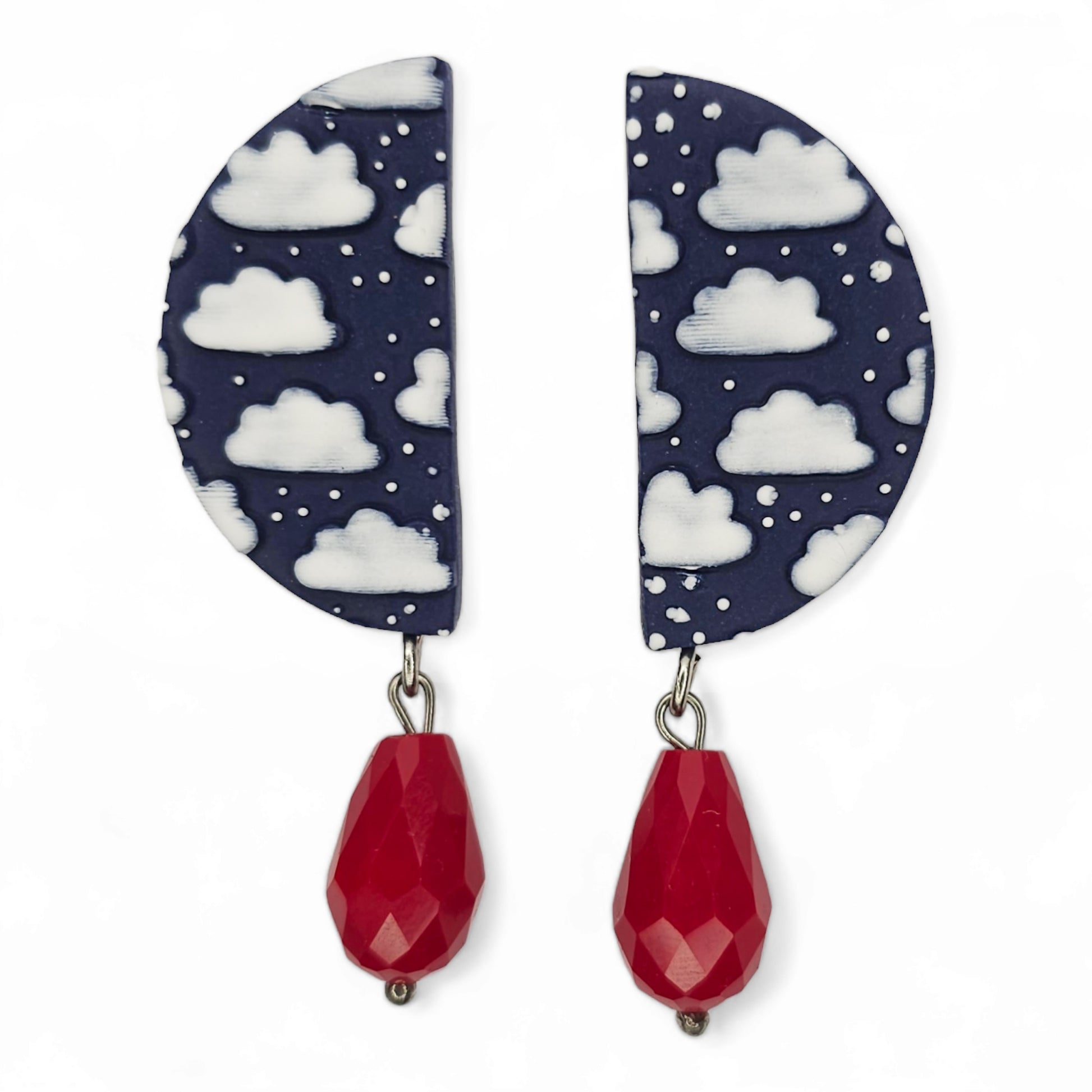 Σκουλαρίκια καρφωτά ημικύκλια μπλε με άσπρα συννεφάκια από πολυμερικό πηλό και κόκκινα κρύσταλλα.