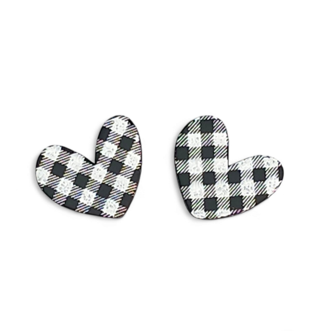 Σκουλαρίκια καρφωτά καρδιές ασπρόμαυρες καρό από πολυμερικό πηλό.