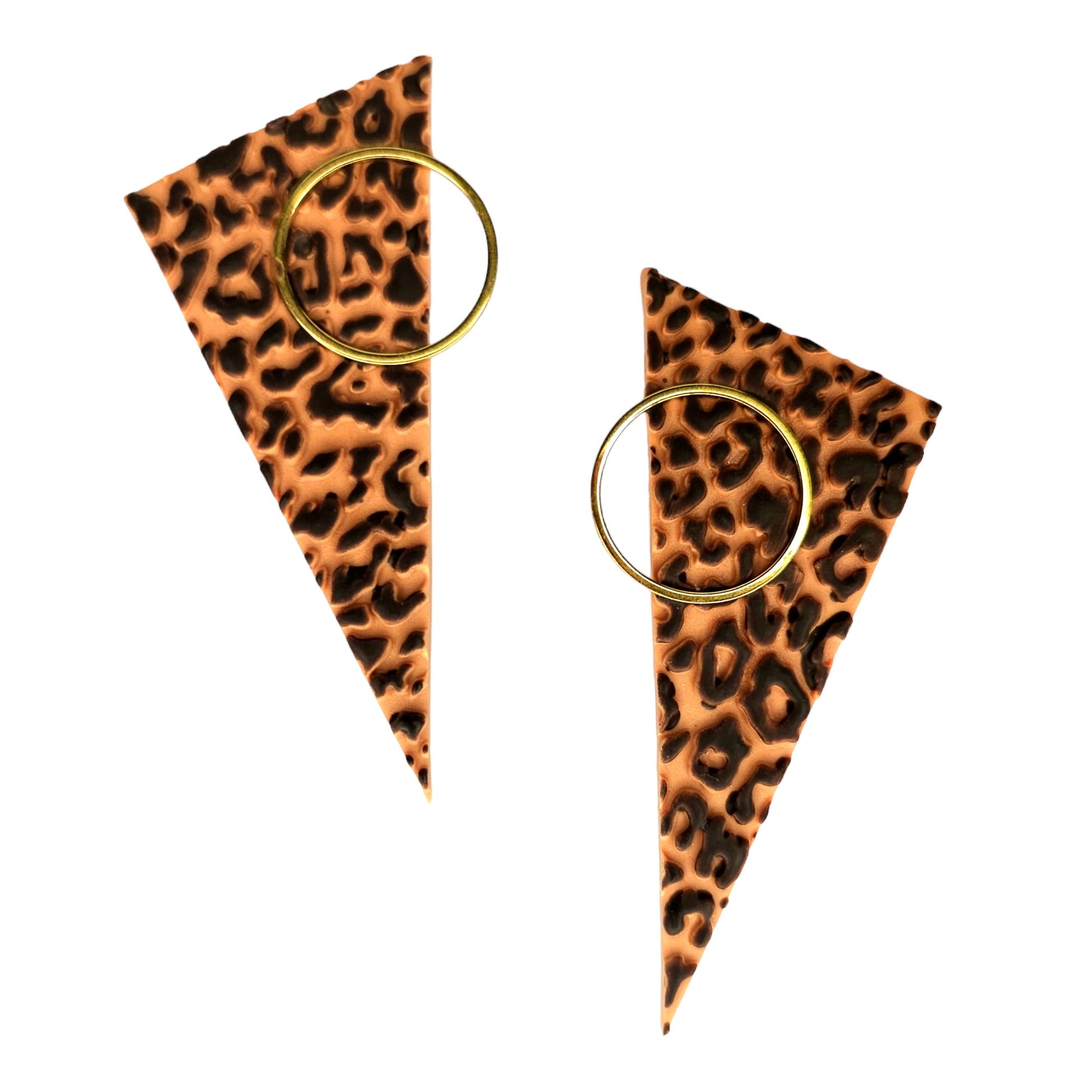 Σκουλαρίκια καρφωτά μεγάλα τρίγωνα καφέ με λεοπάρ μοτίβο από πολυμερικό πηλό και στρογγυλά επιχρυσωμένα ατσάλινα στοιχεία.