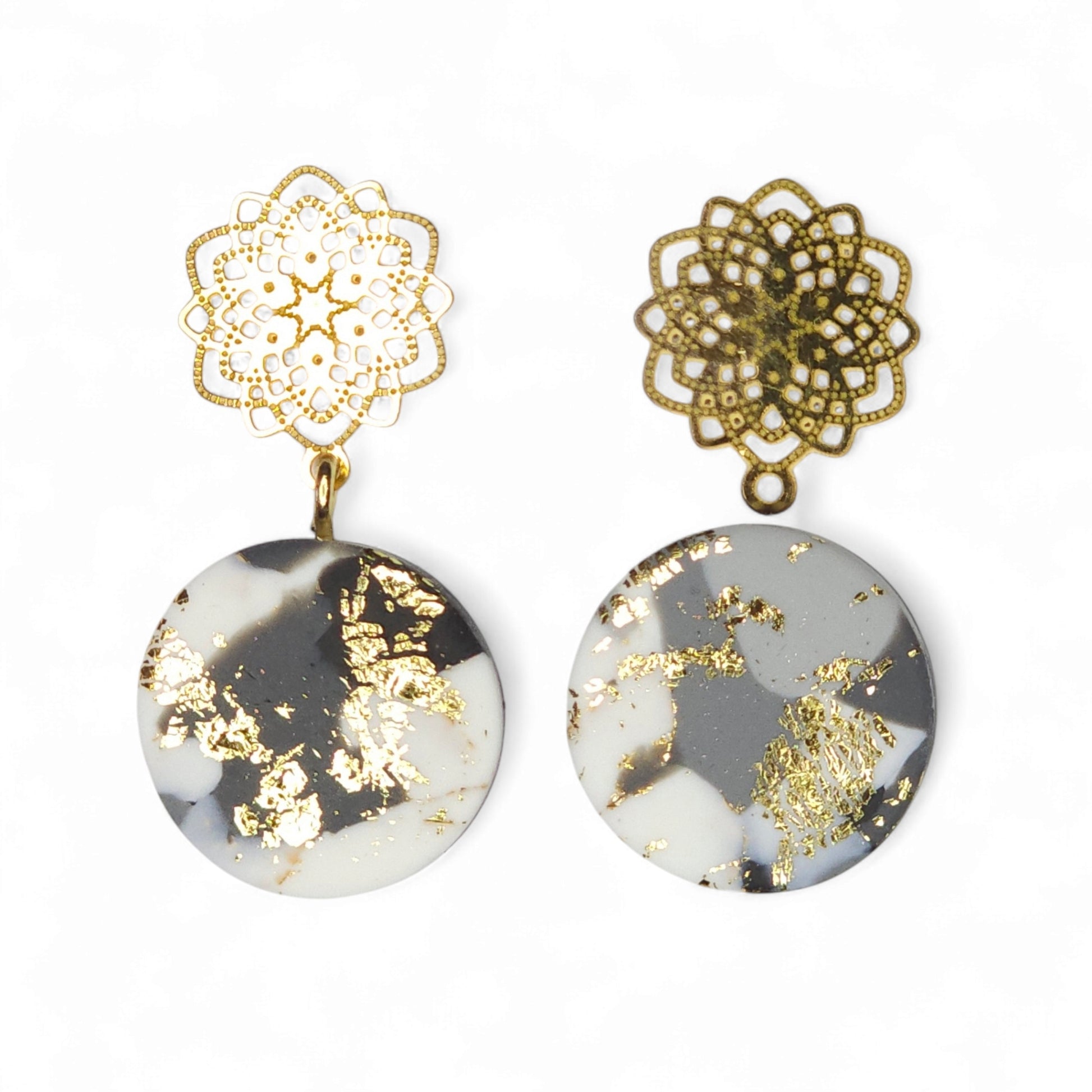 Σκουλαρίκια κρεμαστά στρογγυλά σε γκρι χρυσό μαρμαρωτό μοτίβο από πολυμερικό πηλό με χρυσά δαντελένια καρφάκια