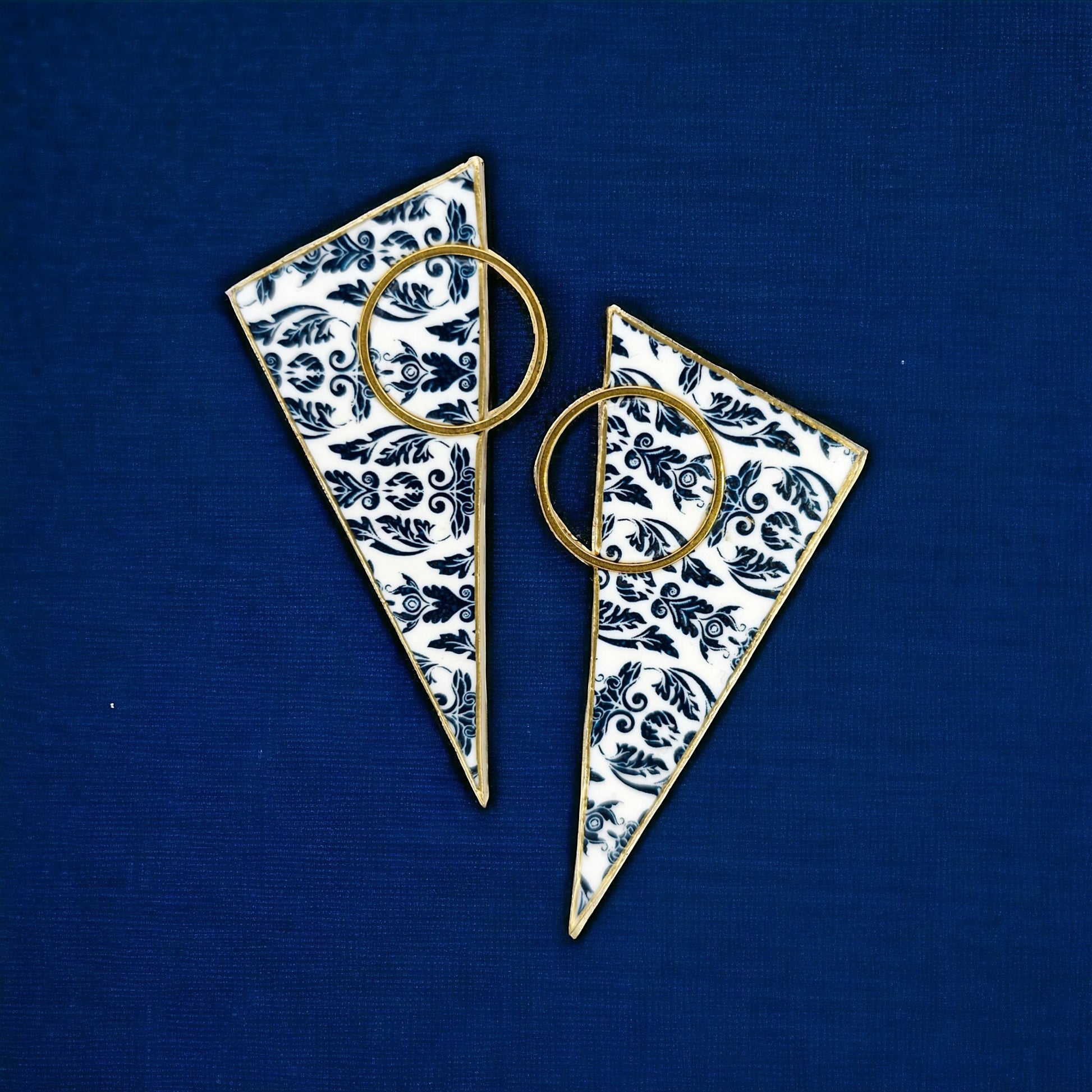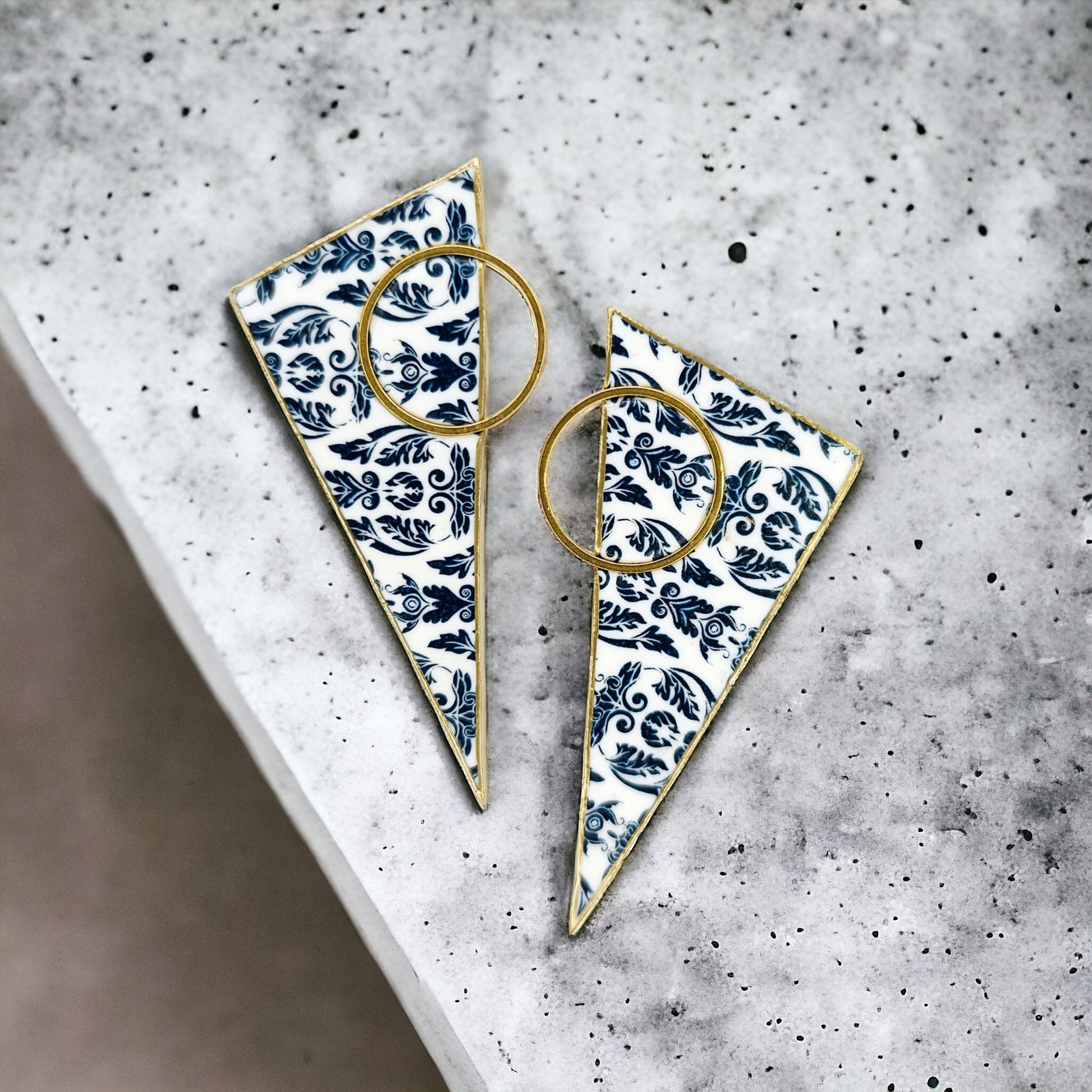 Σκουλαρίκια μεγάλα καρφωτά τρίγωνα με μπλε μεταξοτυπία σε μπαρόκ στυλ και ατσάλινα στοιχεία
