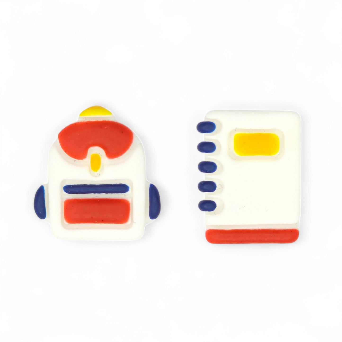 Ανόμοια καρφωτά σκουλαρίκια σημειωματάριο και σχολική τσάντα από πολυμερικό πηλό.