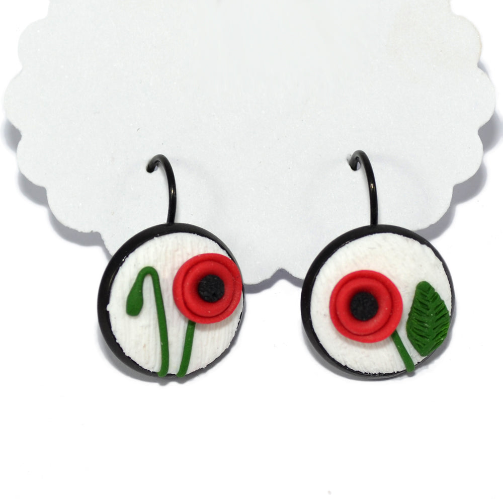 Λίγο κρεμαστά σκουλαρίκια, γλυπτές παπαρούνες με πολυμερικό πηλό σε λευκό φόντο και υποαλλεργικές βάσεις από ανοξείδωτο ατσάλι με μαύρο ανοδιωμένο χρώμα.