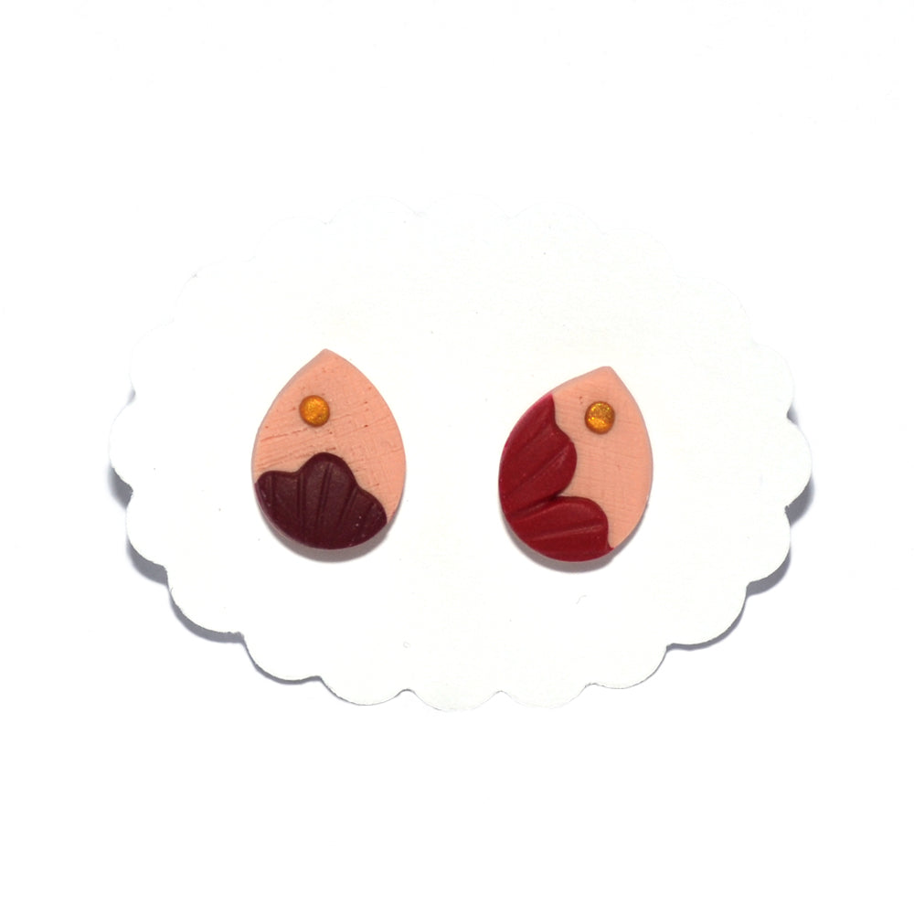 Καρφωτά σκουλαρίκια σταγόνες με ανάγλυφα λουλούδια από πολυμερικό πηλό σε μπορντό αποχρώσεις.