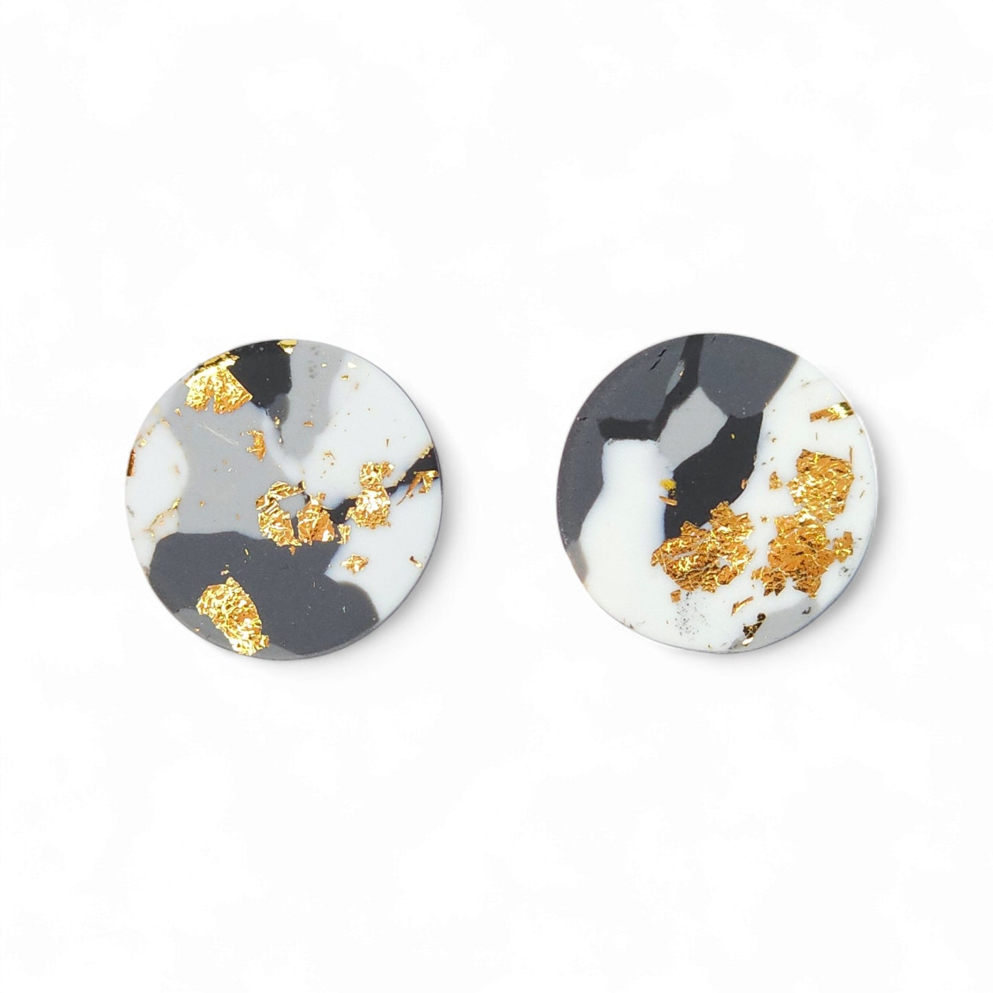 Καρφωτά σκουλαρίκια στρογγυλά με γκρι χρυσό μαρμαρωτό μοτίβο από πολυμερικό πηλό.