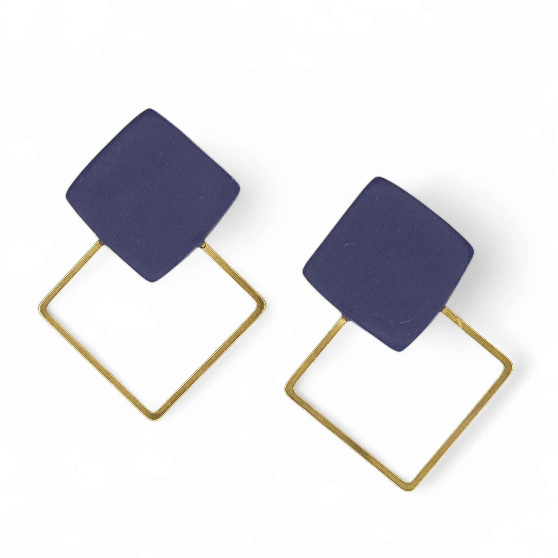 Κομψά καρφωτά σκουλαρίκια με ένα μπλε μαρίν τετραγωνάκι από πολυμερικό πηλό κι ένα επιχρυσωμένα ατσάλινο.