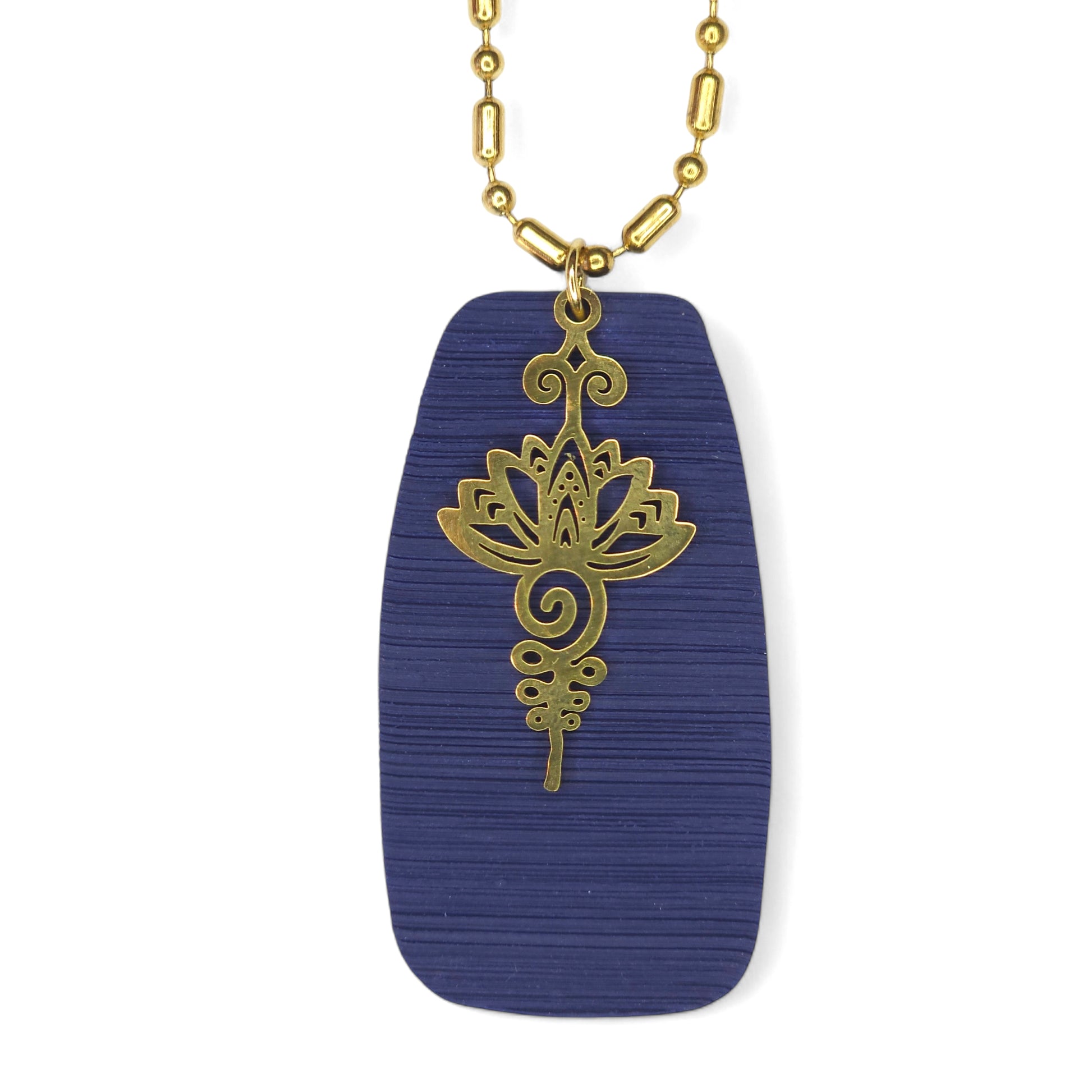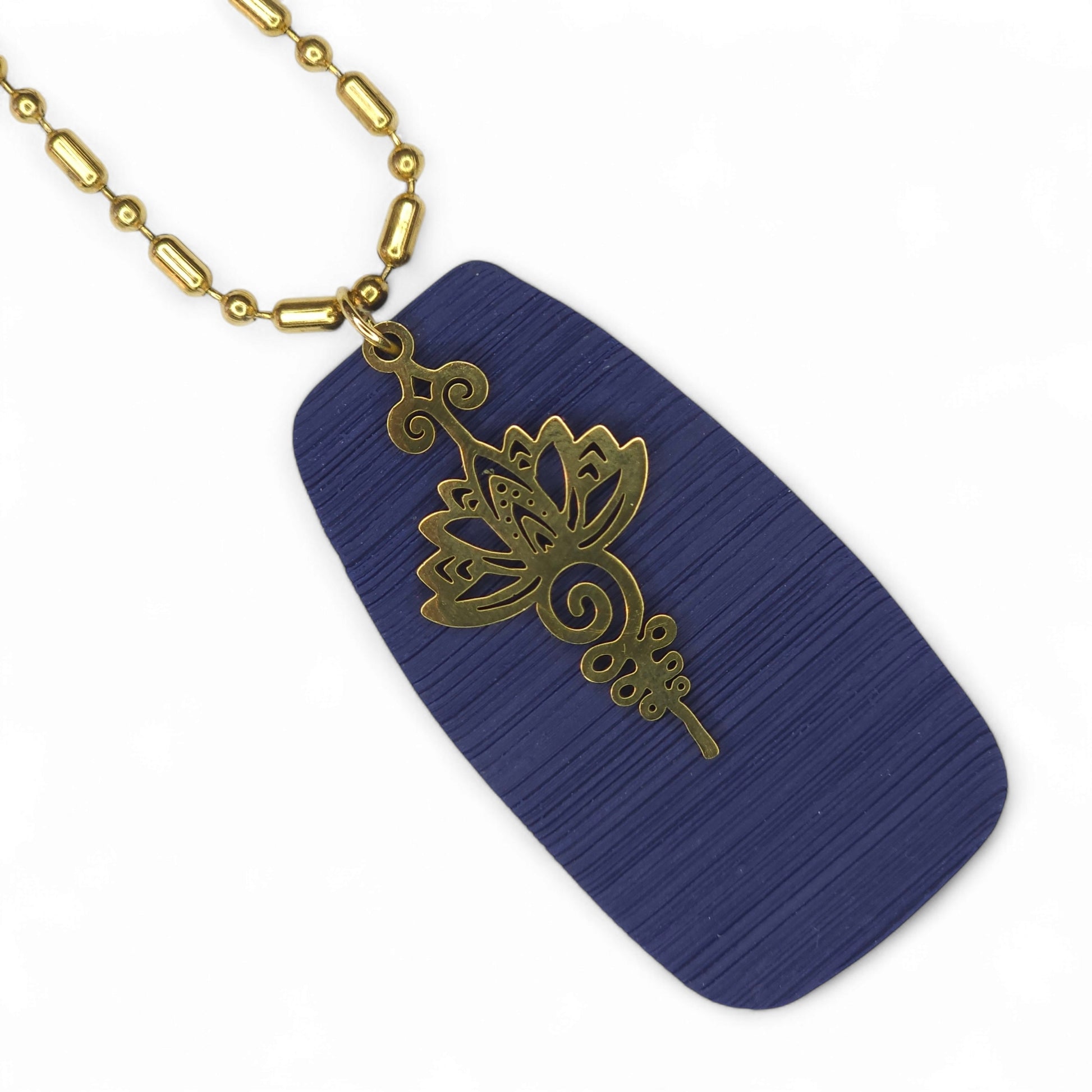 Κομψό μακρύ κολιέ, με ένα ανάγλυφο μπλε μαρίν στοιχείο από πολυμερικό πηλό κι ένα επιχρυσωμένο ατσάλινο στοιχείο.