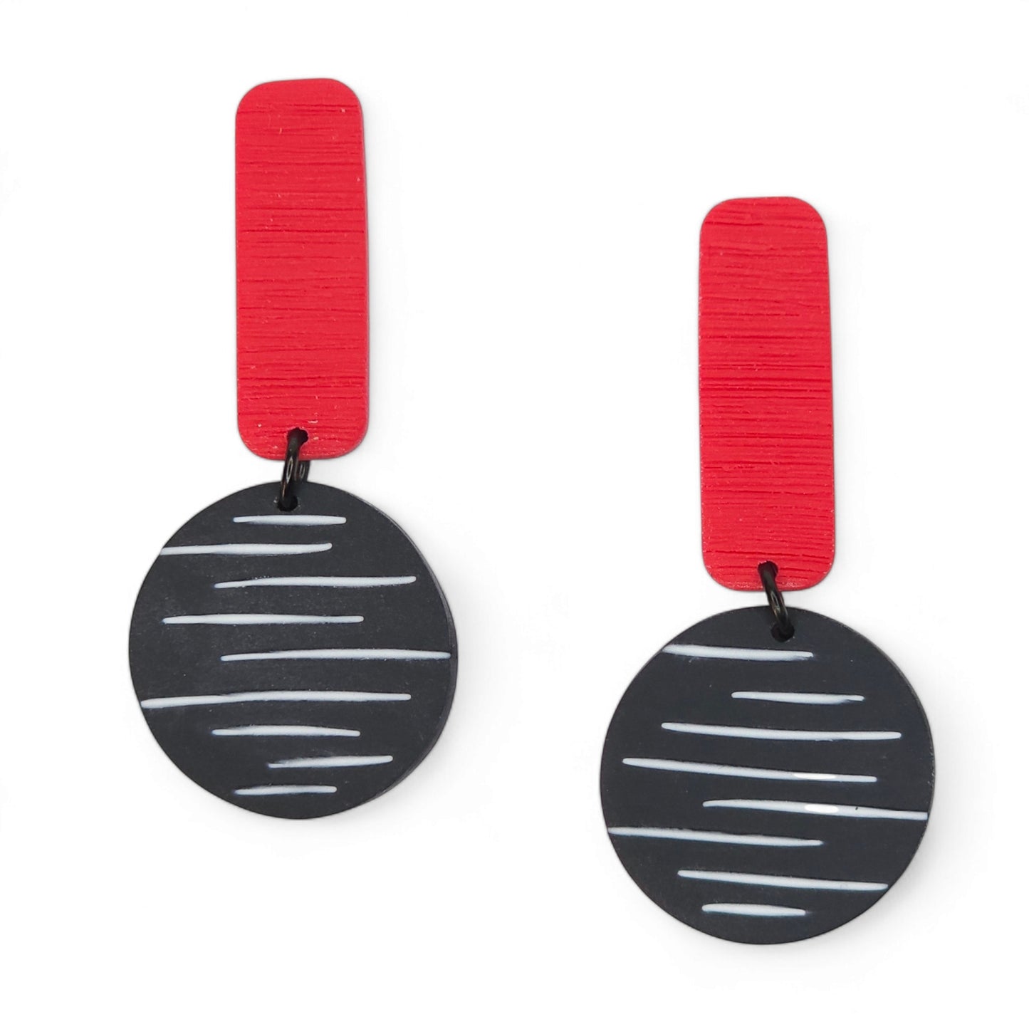 Κρεμαστά γεωμετρικά σκουλαρίκια σε μαύρο κόκκινο από πολυμερικό πηλό.