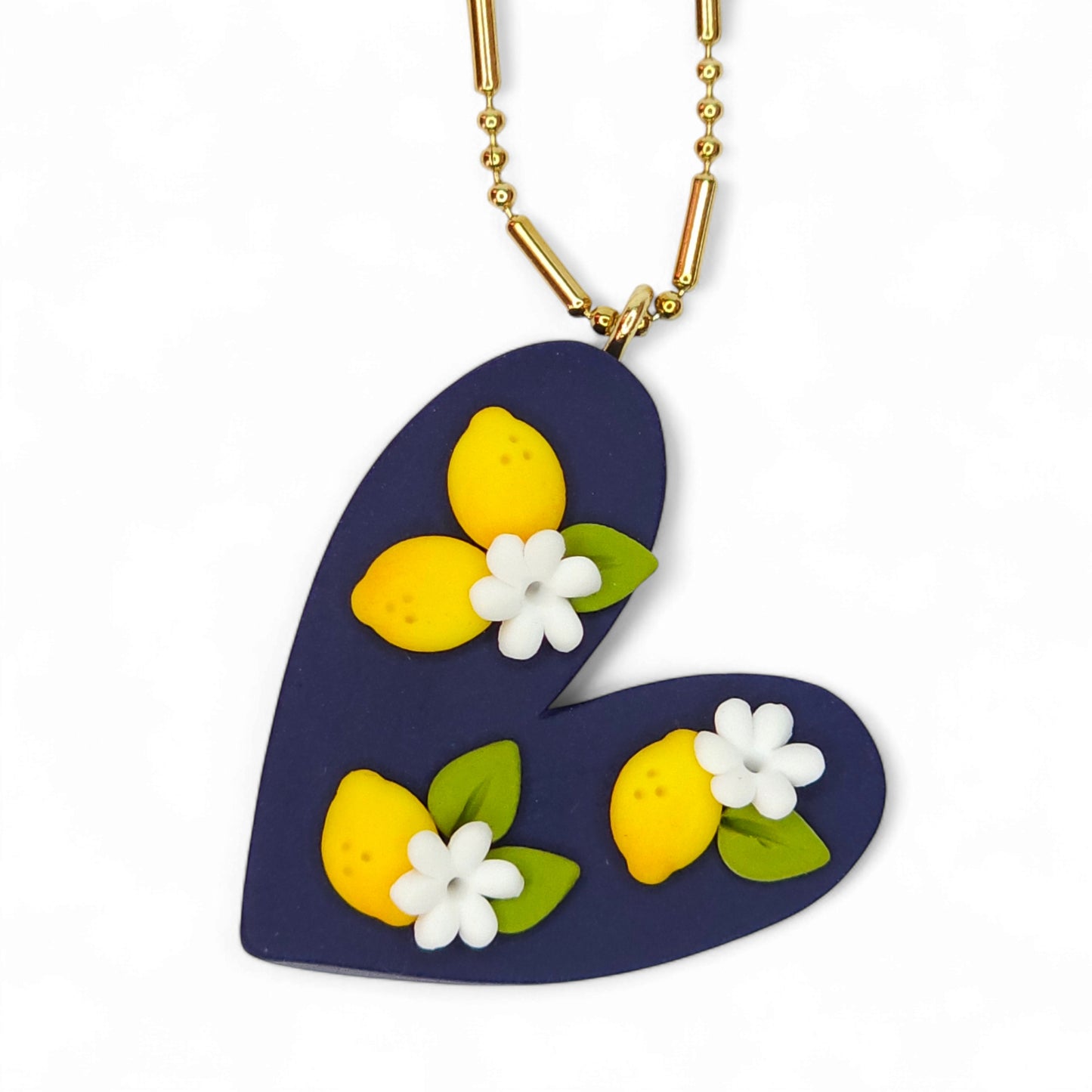 Μακρύ κολιέ καρδιά με κίτρινα λεμόνια σε μπλε φόντο από πολυμερικό πηλό.