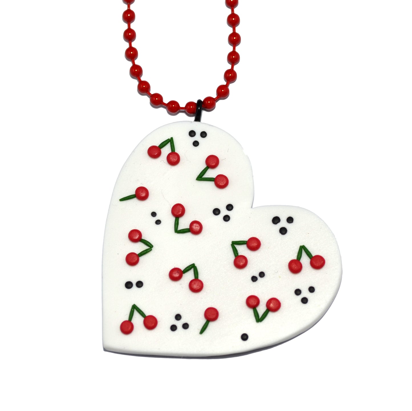 Μακρύ κολιέ μεγάλη καρδιά με μικρούτσικα κόκκινα κερασάκια σε λευκό φόντο με τοσοδούλικες μαύρες βουλίτσες και ταιριαστή αλυσίδα αλουμινίου με κόκκινες μπίλιες (75εκ.)