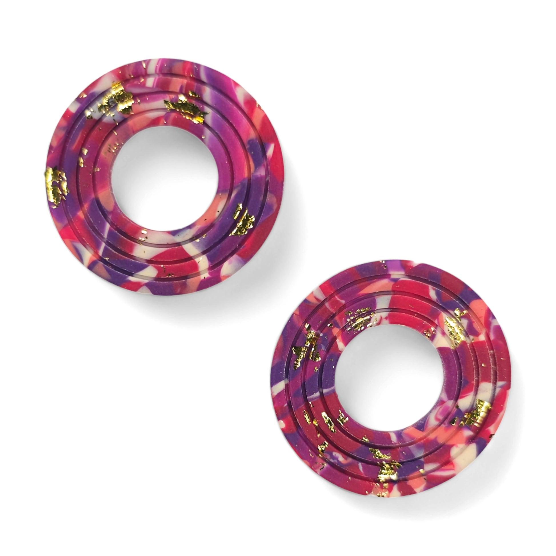 Μεγάλα καρφωτά στρογγυλά σκουλαρίκια φούξια μωβ χρυσό μαρμαρωτό μοτίβο από πολυμερικό πηλό.