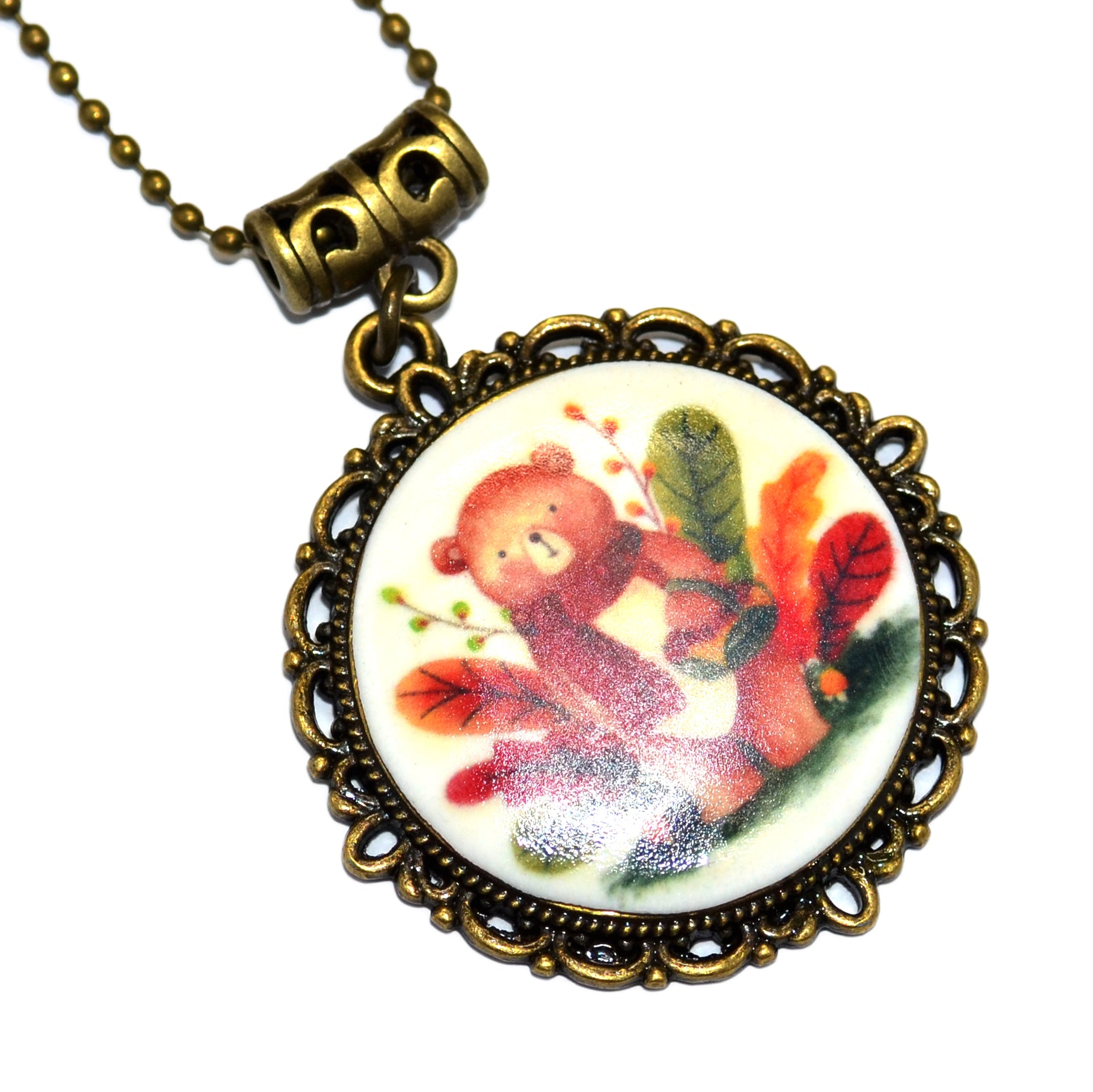 Μενταγιόν σε βίνταζ μπρονζέ στρογγυλή βάση, με χειροποίητο καμποσόν από πολυμερικό με την τεχνική μεταφοράς εικόνας με αρκούδα σε φθινοπωρινό μοτίβο.