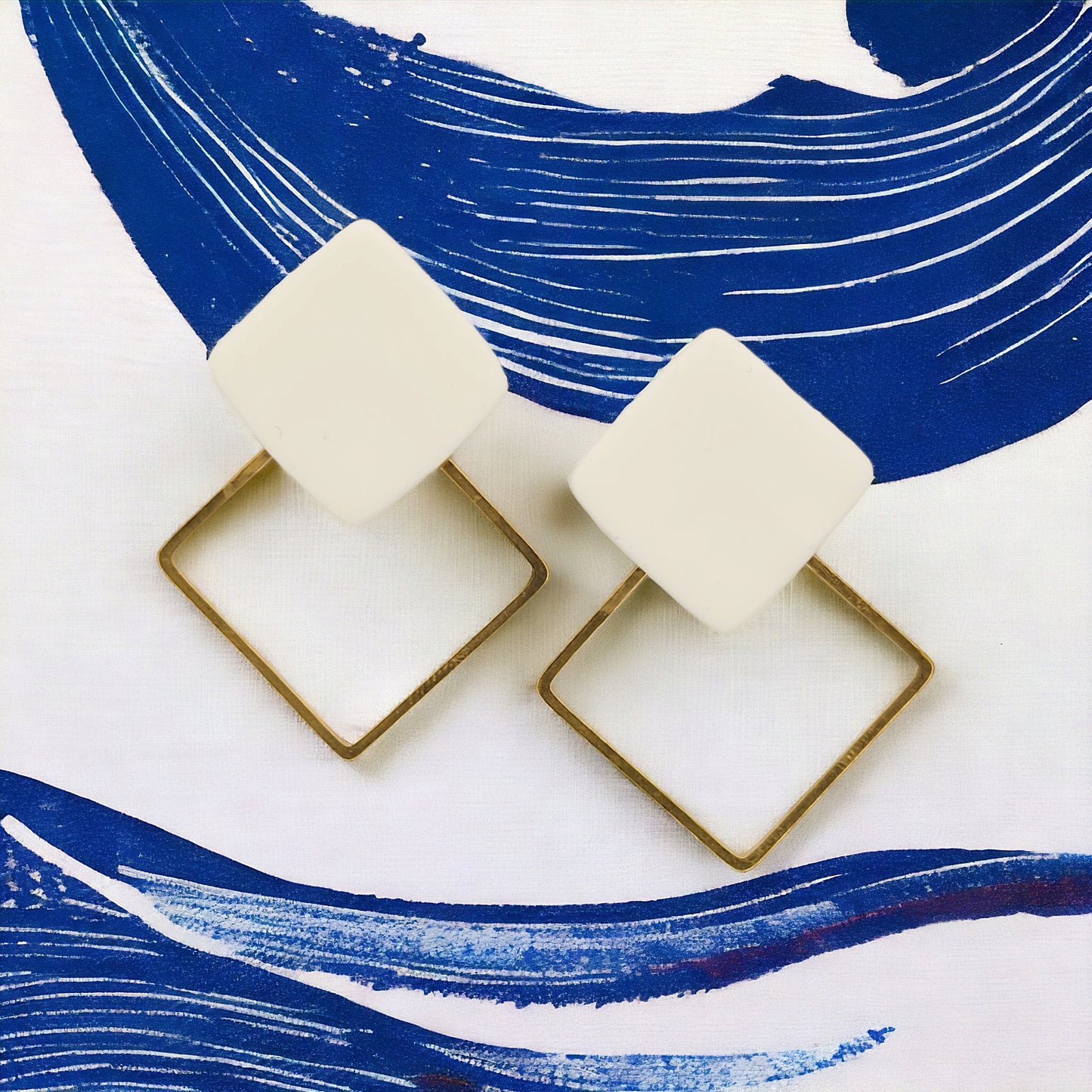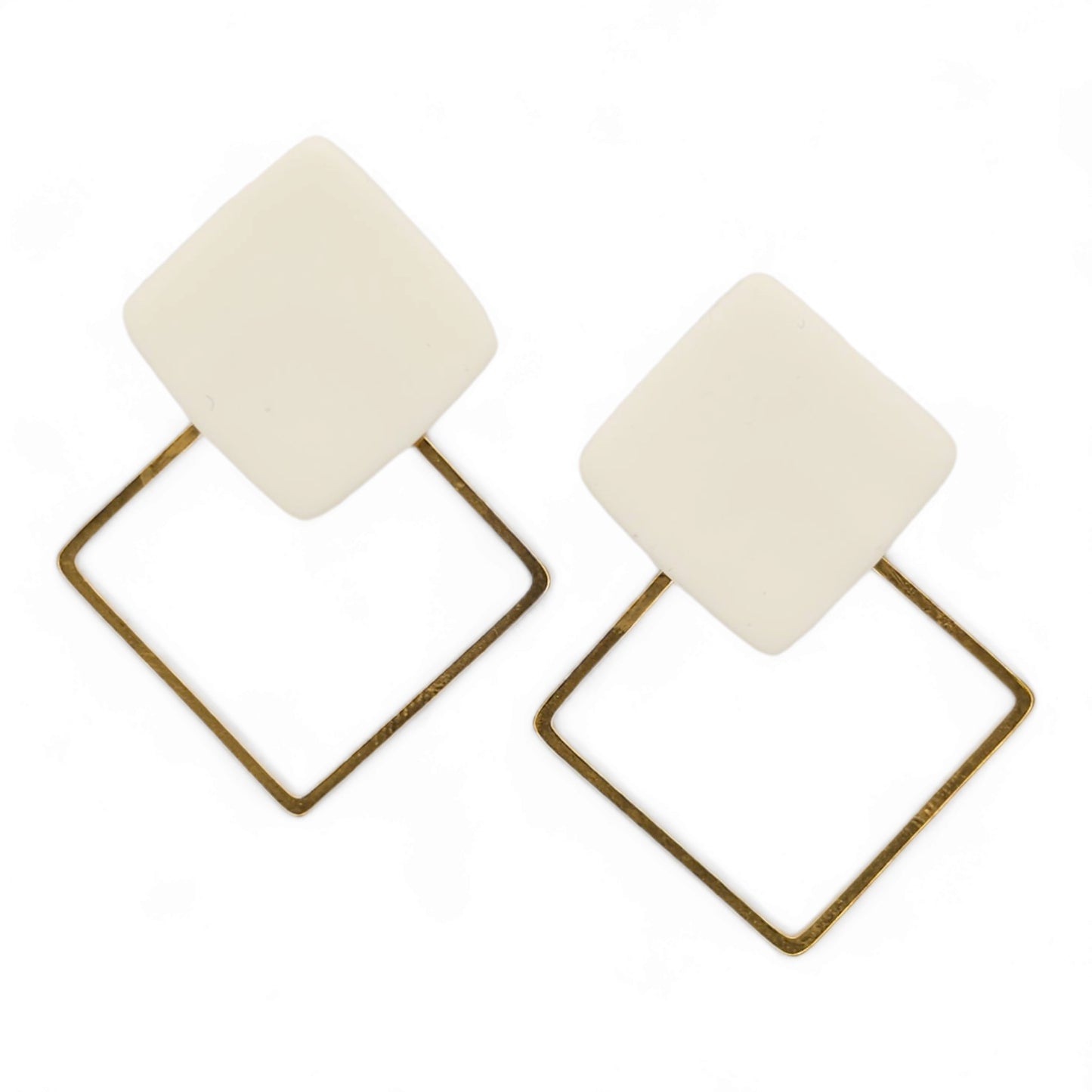 Σκουλαρίκια καρφωτά τετράγωνα λευκά από πολυμερικό πηλό και επιχρυσωμένα τετράγωνα ατσάλινα στοιχεία.