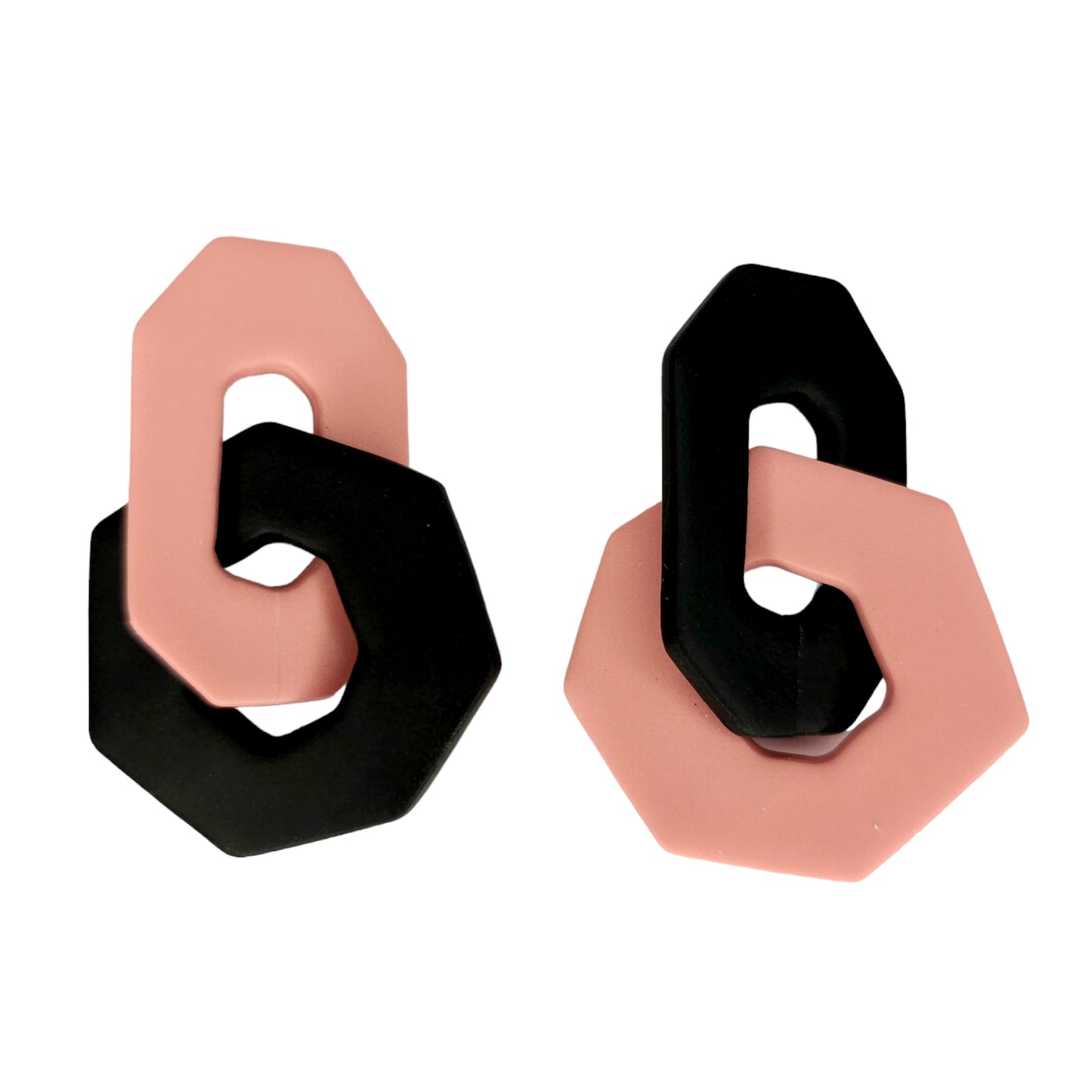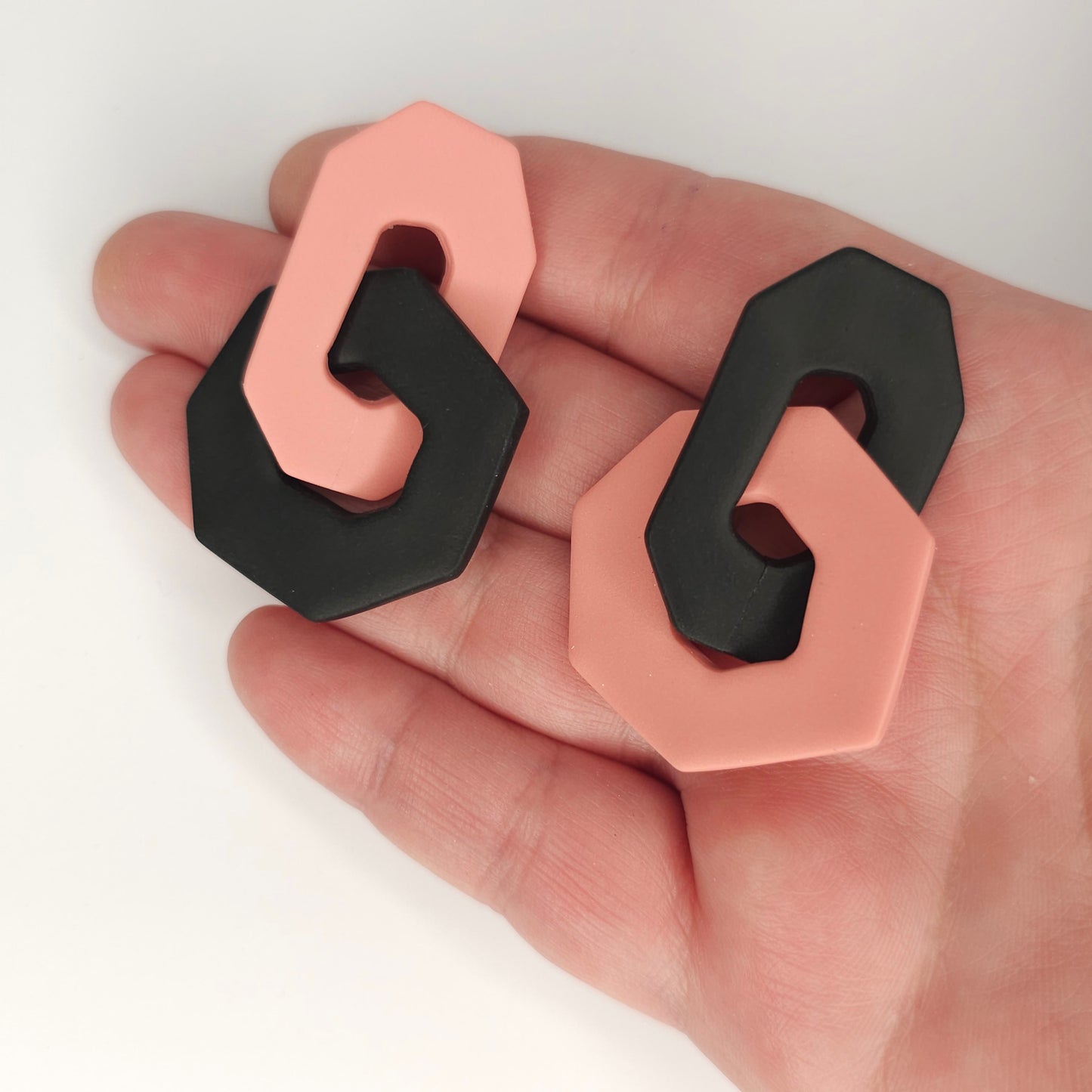 Σκουλαρίκια πολύγωνοι ασύμμετροι κρίκοι σε ροζ με μαύρο από πολυμερικό πηλό.
