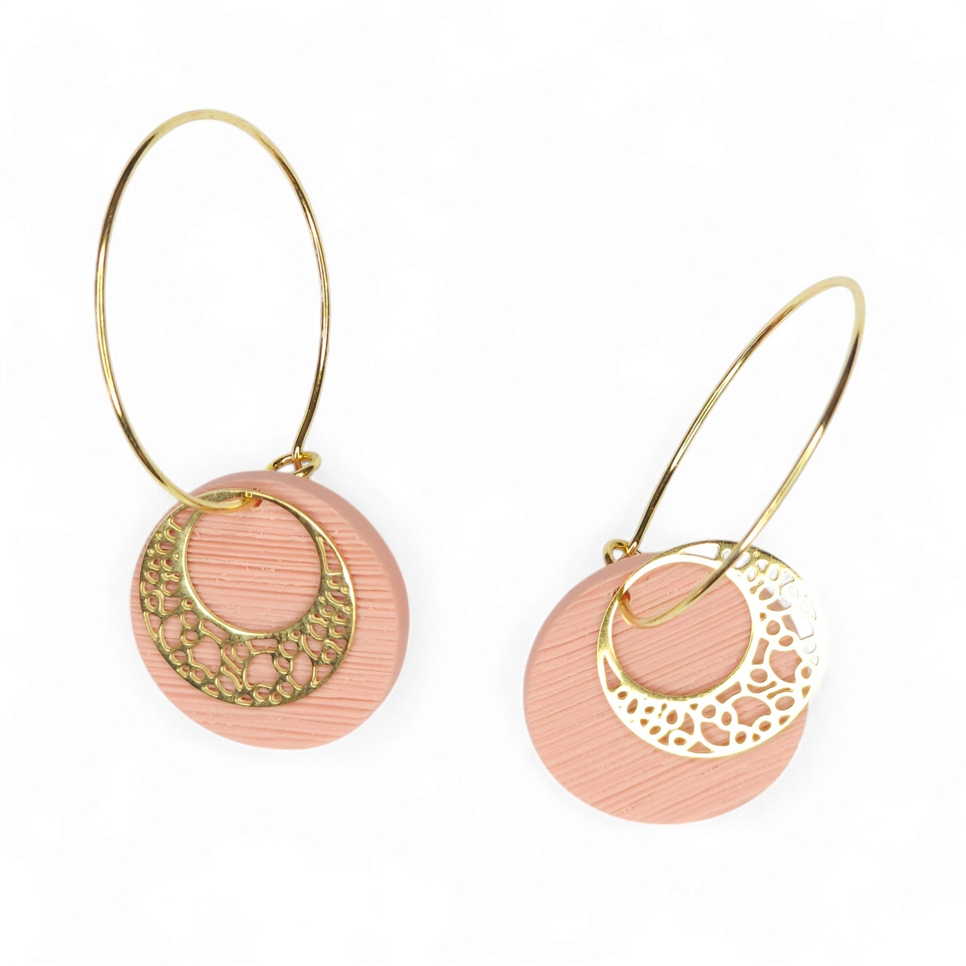 Σκουλαρίκια κρεμαστά υποαλλεργικοί επιχρυσωμένοι ατσάλινοι κρίκοι με στρογγυλά ροζ σάπιο μήλο από πολυμερικό πηλό και ατσάλινα δαντελένια στοιχεία.