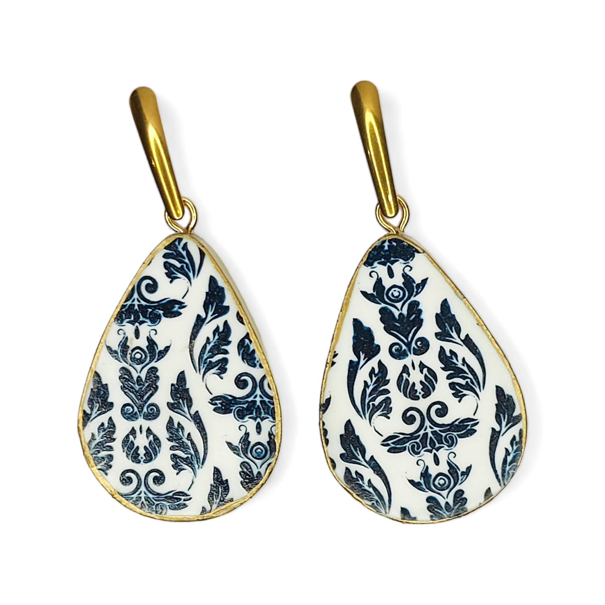 Σκουλαρίκια κρεμαστά λευκά δάκρυα με μπλε μεταξοτυπία σε μπαρόκ στυλ από πολυμερικό πηλό και μακριά επιχρυσωμένα ατσάλινα υποαλλεργικά καρφάκια.