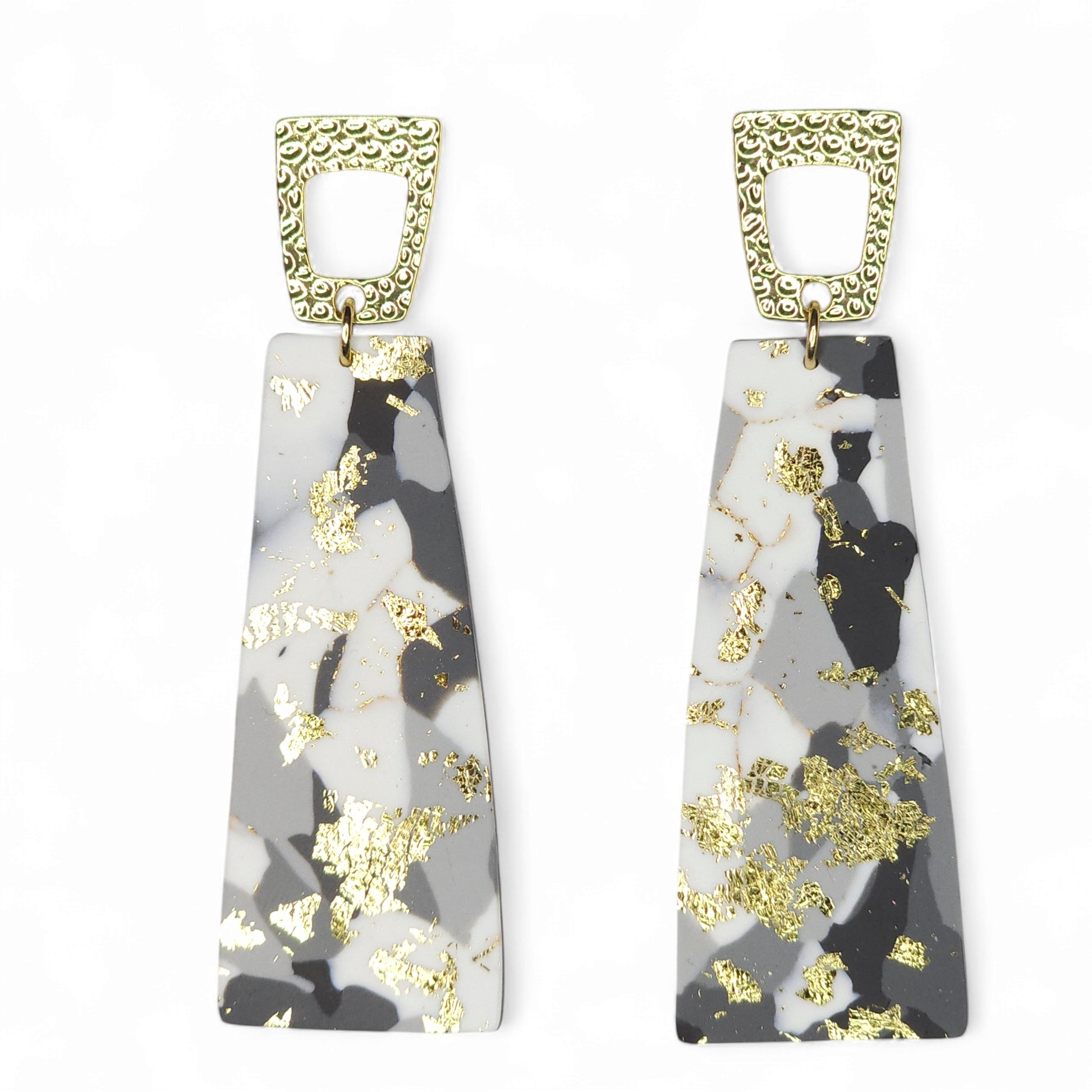Σκουλαρίκια κρεμαστά με μοντέρνο κόψιμο σε γκρι χρυσό μαρμαρωτό μοτίβο από πολυμερικό πηλό